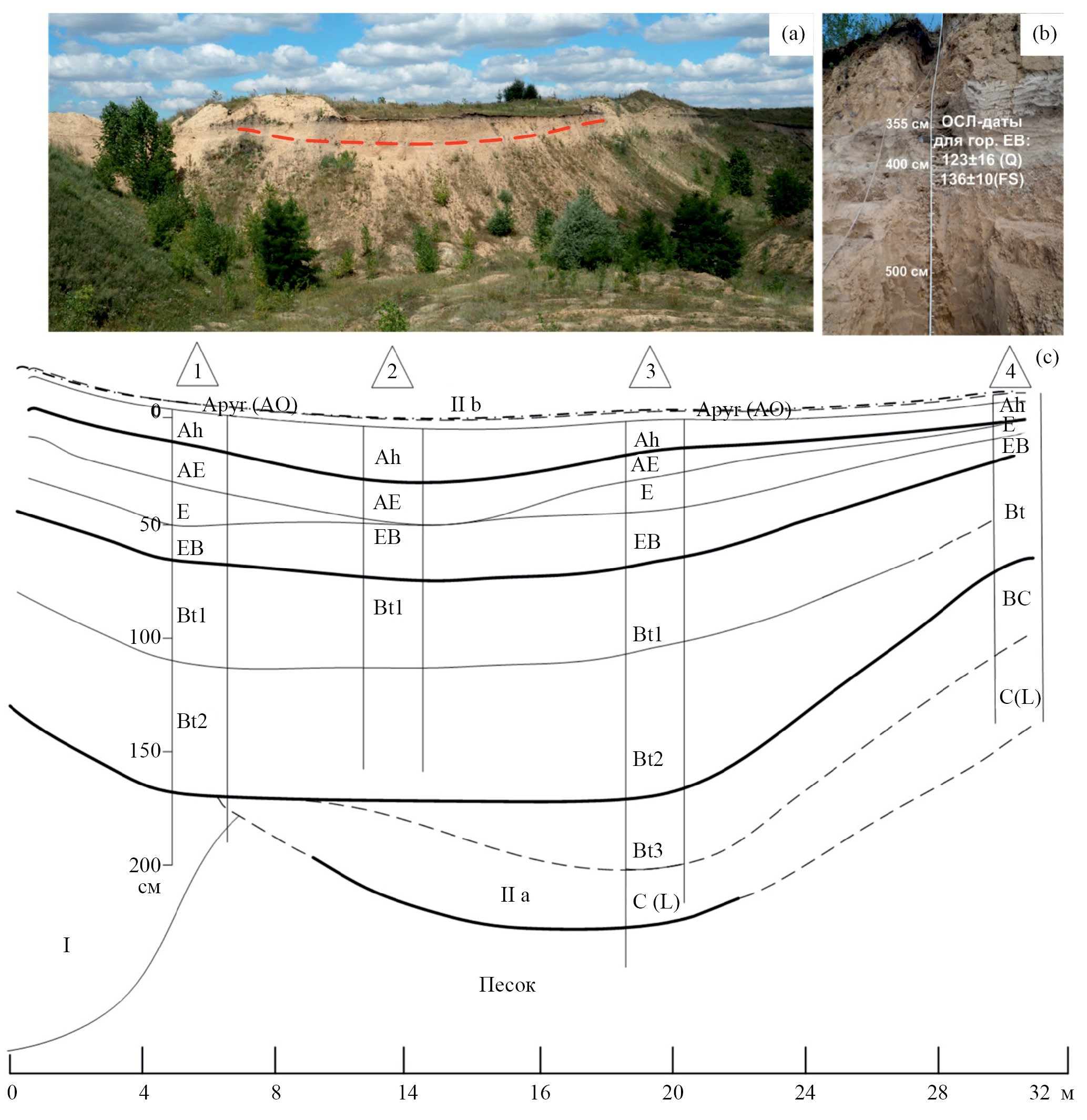 На склоне (разрез 4) и в днище погребенной ложбины (разрезы 1–3) на глубине 3.5–5.5 м от поверхности сохранилась межледниковая палеопочва, образуя неконтрастную катену (рис. 2с). Тип профиля почвы Аpyr–Аh–Е–ЕB–Bt–С не меняется, изменяются только мощности горизонтов. В тальвеге палеоложбины (разрез 2) мощность гумусовых горизонтов наибольшая – 50 см, тогда как в других разрезах – 25–35 см. В разрезах 1 и 3 увеличена мощность элювиальных горизонтов Е и ЕВ (30–40 см). Глубина верхней границы горизонта Вt1 от поверхности 390–400 см в трех разрезах (1–3), как и мощность профиля в двух разрезах 1 и 3 значительные (160–185 см) (рис. 2b, 2c). В разрезе 4, расположенном выше по палеосклону, рышковская палеопочва залегает ближе к поверхности (305–383 см), мощность ее профиля гораздо меньше – 78 см, что характерно для более крутых участков склонов. Выше по склону от разреза 4 рышковская палеопочва круто поднимается к современной поверхности и выклинивается: сначала исчезает гумусово-аккумулятивный Аh, затем элювиальный Е и иллювиально-глинистый Bt горизонты.