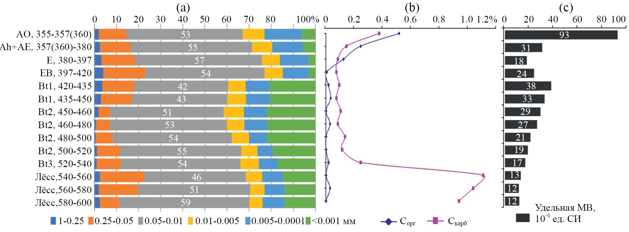 Рис. 4. Гранулометрический состав (a), содержание углерода органического и карбонатного (b), величины удельной магнитной восприимчивости (c) в профиле палеопочвы МИС 5е в Танеевском карьере