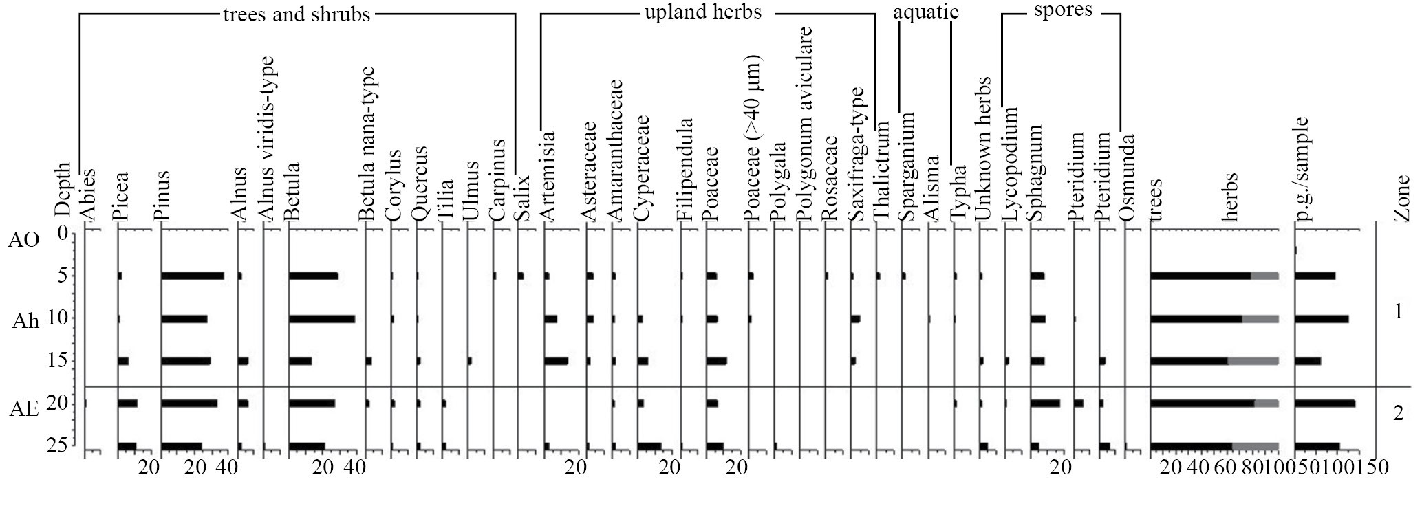 В горизонте AE (375–380 или [20–25] см) древесные составляют 57–65% от общего спектра. Доминирует сосна (Pinus sylvestris) и береза (Betula alba-type) – примерно по 20%. Кроме того, заметно присутствие ели (Picea) – около 9% и ольхи (Alnus) – 2–5%. Единично встречены дуб (Quercus), липа (Tilia) и лещина (Corylus). Травянистые составляют 10–30% от общего спектра, в основном за счет злаков (Poaceae) и осоковых (Cyperaceae), остальные таксоны встречены единично. Среди споровых, составляющих 11–25%, преобладают сфагновые мхи (Sphagnum), единично встречены споры плаунов (Lycopodium) и папоротников из семейств Polypodiaceae, орляка (Pteridium) и осмунды (Osmunda).