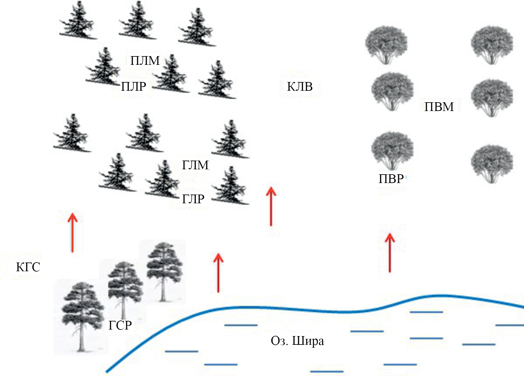 Весной 2015 г. лесные культуры вяза, лиственницы и сосны пострадали от пожара, глубина прогара почвы на отдельных участках достигала 0.8–1.5 см. В августе 2017 г. в зависимости от степени повреждения огнем в насаждениях были выделены участки гари и пожарища, при этом, согласно терминологии Курбатского [18], гари определяли как с полностью сгоревшими растениями, а пожарища – с поврежденными огнем, но продолжавшими вегетировать. Поскольку пожар повредил все лесные культуры, в качестве относительного контроля для участков лиственницы и вяза были взяты образцы почвы на целине (старая залежь), граничащей с этими посадками (верхняя часть макросклона), для участков сосны – на целине (старая залежь), прилегающей к посадкам сосны, менее всего затронутой пожаром (нижняя часть макросклона). Растительность на контрольных участках представлена травянистыми видами. Исследовали следующие варианты: ГЛР – гарь лиственница ризосфера, ГЛМ – гарь лиственница междурядье; ГСР – гарь сосна ризосфера, КГС – контроль для участка “гарь сосна ризосфера”, ПЛМ – пожарище лиственница междурядье, ПЛР – пожарище лиственница ризосфера, ПВМ – пожарище вяз междурядье, ПВР – пожарище вяз ризосфера, КЛВ – контроль для участков с лиственницей и вязом. Схематичное расположение пробных площадей представлено на рис. 1.