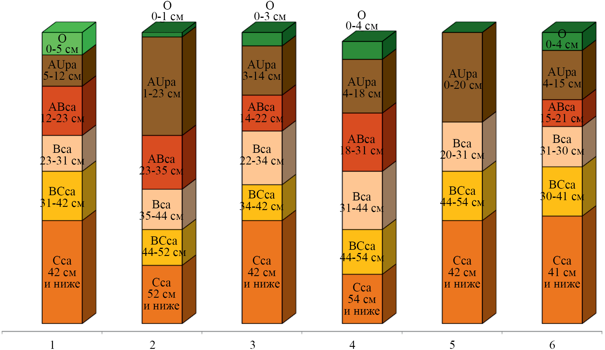 Рис. 2. Строение профилей почв под искусственными насаждениями в прибрежной зоне озера Шира: 1 – контрольный участок для вариантов с лиственницей и вязом, 2 – участок для вариантов ПВР и ПВМ, 3 – участок для вариантов ПЛР и ПЛМ, 4 – участок для вариантов ГЛР и ГЛМ, 5 – контрольный участок для варианта с сосной, 6 – участок для варианта ГСР.