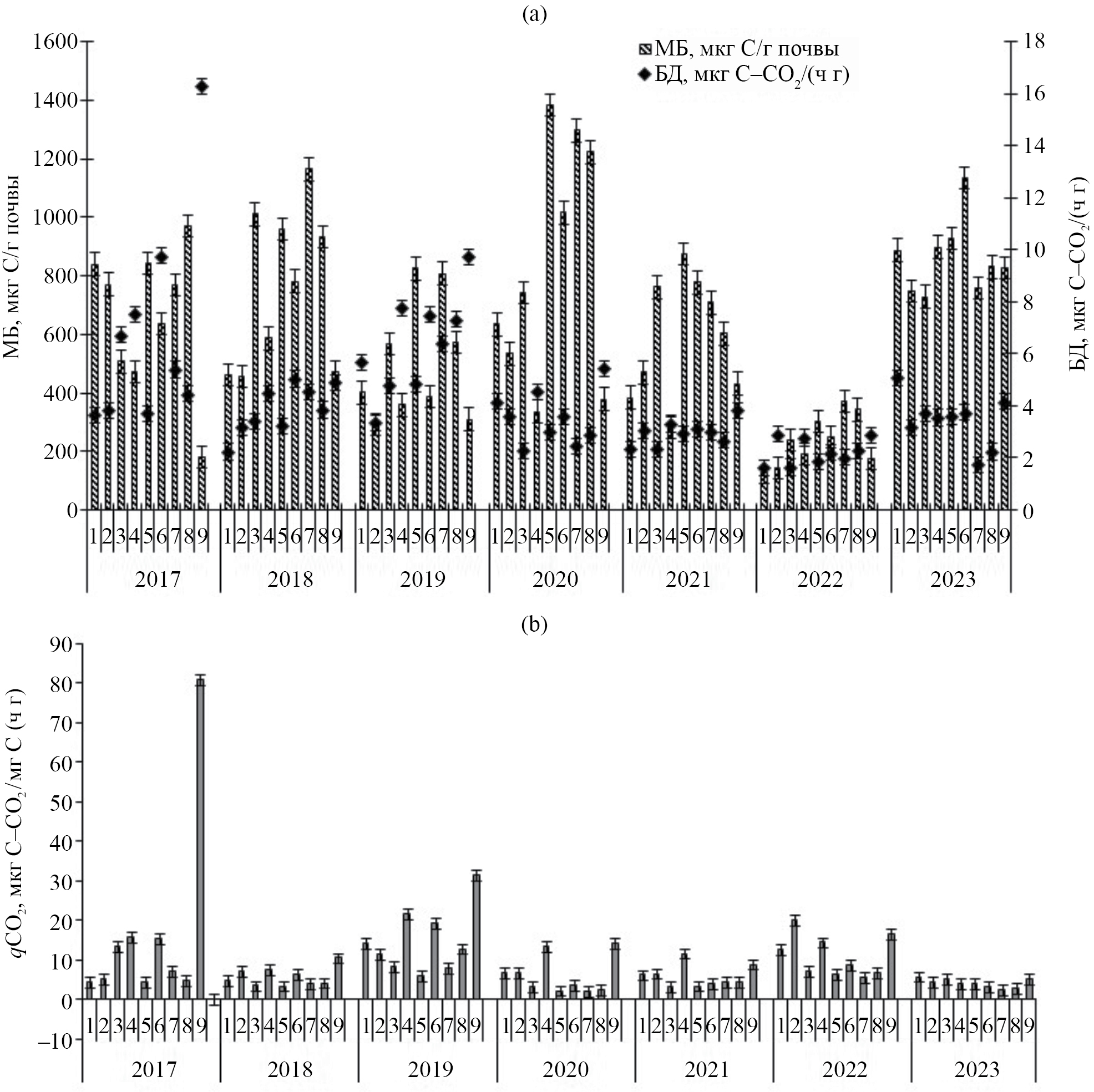 Микробный метаболический коэффициент (qCO2) рассчитывали как отношение БД к МБ [1, 38]. БД/МБ = qСО2 (мкг С–CO2)/(мг С ч).