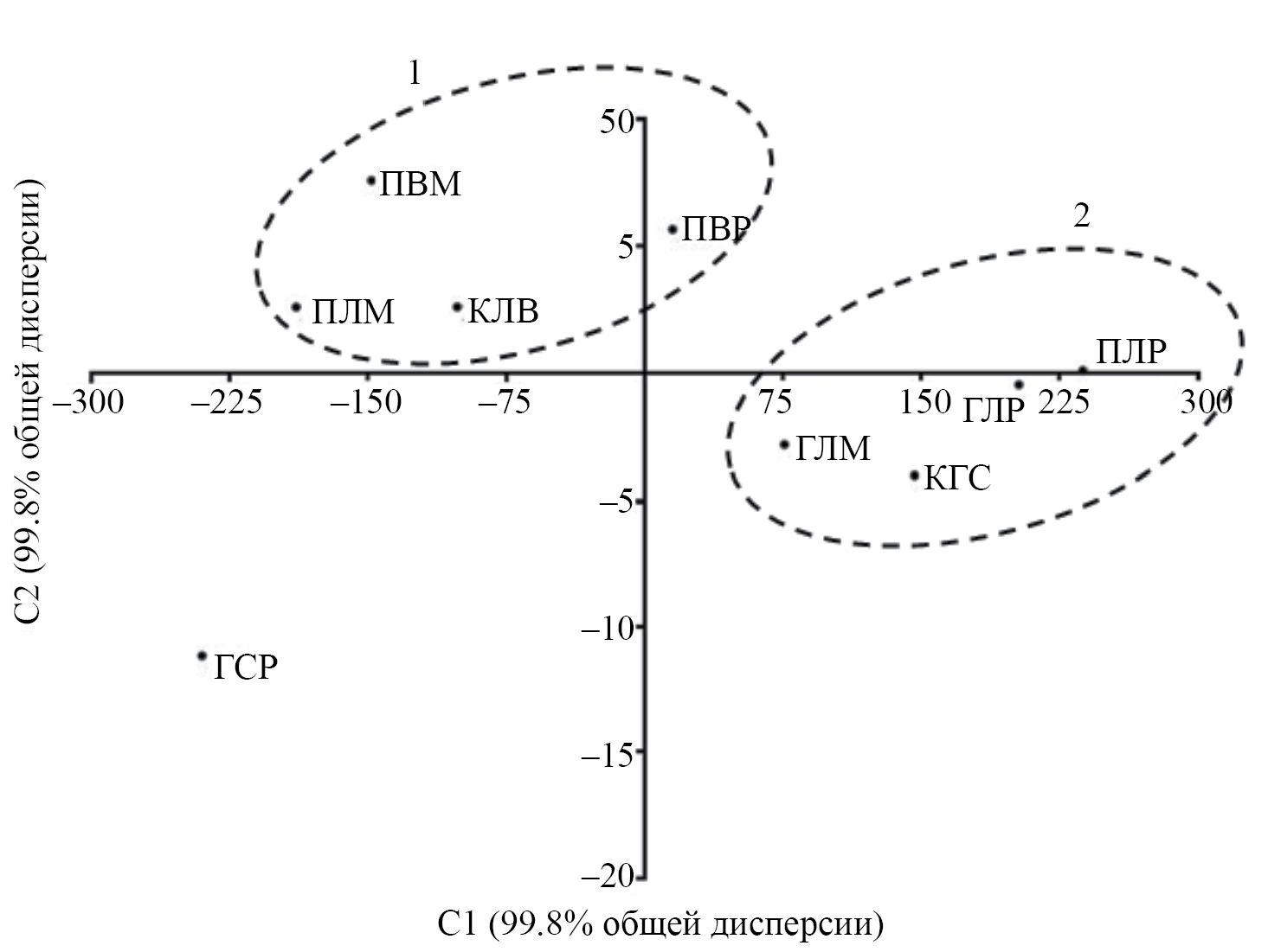 Метод главных компонент, проведенный на основе биологических и химических параметров почвы исследуемых участков, показал различия между вариантами. На первую компоненту приходилось 99.8% общей дисперсии, на вторую – 0.1%. В плоскости этих двух первых компонент выделяются два облака, различия между которыми в большей степени определялись содержанием Смик (МБ) и Кг. В рамках каждого облака варианты различались по значению микробного метаболического коэффициента и активности инвертазы. Вариант ГСР, лежащий в левой полуплоскости первой компоненты, сильно отличался от всех остальных как по содержанию Смик и по qCO2, так и активности инвертазы.