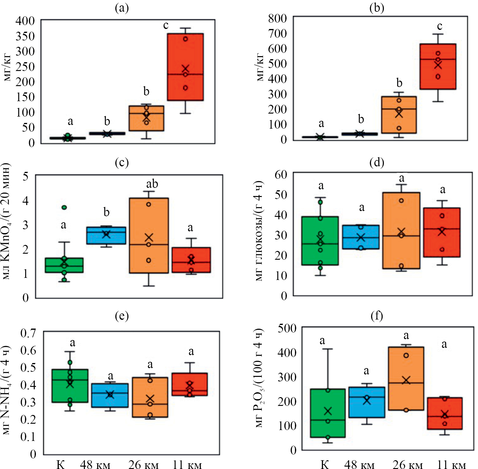 Статистическая обработка данных. Результаты статистически обрабатывали с помощью программ MS Excel, Past (4.13). Перед началом анализа исходные данные были проверены на нормальность с помощью теста Шапиро–Уилка. Значимость различий между вариантами оценивали с помощью U-критерия Манна–Уитни. Данные на графиках приведены в виде боксплотов, отражающих медианы и межквартильные интервалы. Латинские буквы указывают на значимые отличия. При сравнении нескольких выборок количественных данных использовали непараметрический критерий Краскела–Уоллиса. Далее для массивов данных проводили анализ сходства (ANOSIM) и затем анализ главных компонент (PCA), при этом данные были предварительно нормализованы. Для анализа на наличие корреляций использовали коэффициенты корреляции Пирсона. Значимые различия оценивали при p < 0.05.