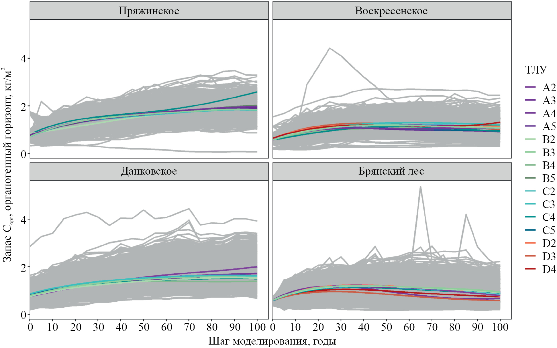 Обработка данных. Расчеты запасов ПОВ для временного отрезка 100 лет с шагом 1 год выполняли для каждого таксационного выдела с учетом соответствующих ему начальных характеристик древостоя (видовой состав, возраст и другие таксационные показатели) и почвенных данных (запасы Сорг и Nобщ в органогенных горизонтах лесной подстилки и органо-минеральной части профиля, гранулометрический состав и др.). В качестве средней оценки динамики показателей для разных вариантов ТЛУ на каждом из объектов исследования использовали медианные значения. Проведены расчеты стока углерода в почвах за 100 лет для территорий объектов исследования на основе суммирования данных всех таксационных выделов с учетом занимаемой ими площади. Также для территорий исследования оценивали накопление углерода в древостоях и других компонентах лесных экосистем, что позволило определить вклад почв в нетто-поглощение углерода.