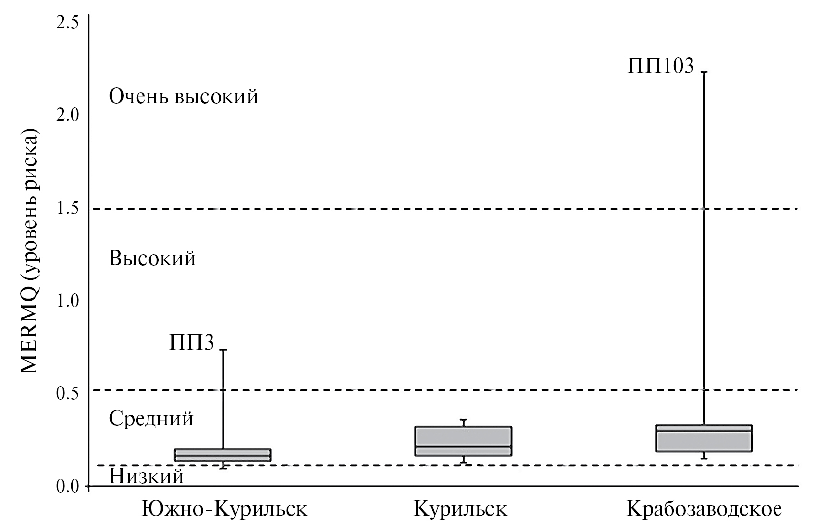 Среднее значение MERMQ почв в пределах г. Курильск ниже и составляет 0.225, диапазон значений – от 0.121 до 0.356. Все изученные в пределах города почвы имеют уровень среднего риска токсичности. Максимальный риск токсичности выявлен в южной части города, где расположена ремонтная база и засольный цех. Риск токсичности почв этого района обусловлен загрязнением Ni, Cr и Pb.