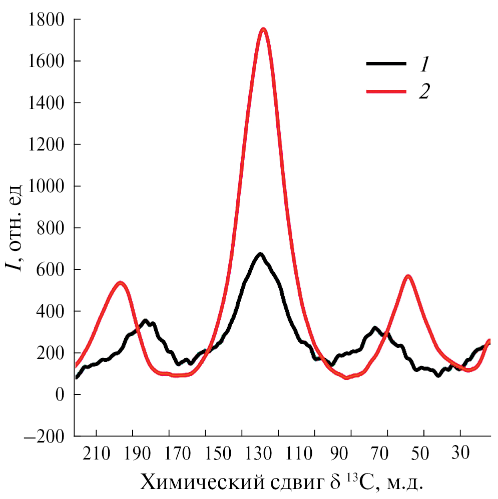 Рис. 1. Спектры CP/MAS 13C ЯМР образцов биочара, полученного из куриного помета (1), и биочара, полученного из кукурузы (2): при температуре пиролиза 400ºС и длительности удерживания 2 ч.