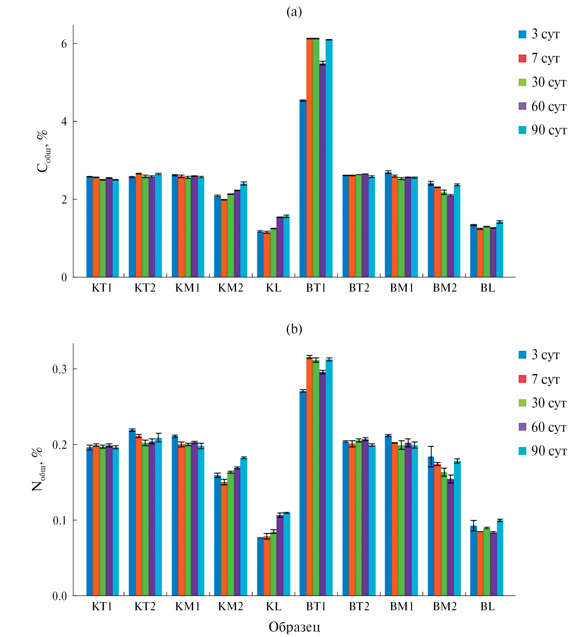 В образцах десятисантиметровых слоев контрольных образцов почвы KT1, KT1, KM1, KM2 и KL и образцов с добавлением биочара BT1, BT1, BM1, BM2 и BL определяли содержание общего азота и общего углерода на автоматическом CN-анализаторе Vario Max Cube (Elementar, Германия) согласно ISO 13878:1998 и ISO 10694:1995, респираторную активность почвенных микроорганизмов – согласно ISO 16072:2002, путем инкубирования почвенных образцов в закрытых сосудах и последующего титриметрического определения выделившегося СО2 после его улавливания щелочью. Физиологический профиль микробного сообщества почвы оценивали методом мультисубстратного тестирования системой Biolog Ecoplate, из тех образцов почвы, которые были послойно отобраны на 90 сут для определения общих С и N. Из этих образцов готовили суспензии (1 : 1000), которые раскапывали по 140 мкл в 96-луночные планшеты Biolog Ecoplate (Biolog, Int, США). Планшеты инкубировали при 25°С в течение 5 сут (до прекращения роста степени окрашенности ячеек), измерения оптической плотности производили с периодичностью в 24 ч на планшетном ридере Multiskan FC (Thermo Fisher Scientific, США). По средней интенсивности окрашивания среды в ячейках (31 ячейка для каждого образца), просуммированной за 5 сут (AWCD), судили об интенсивности потребления субстрата и общей метаболической активности микроорганизмов. Для оценки микробного функционального разнообразия рассчитывали индекс Шеннона (по 31 субстрату для каждого образца) [43].