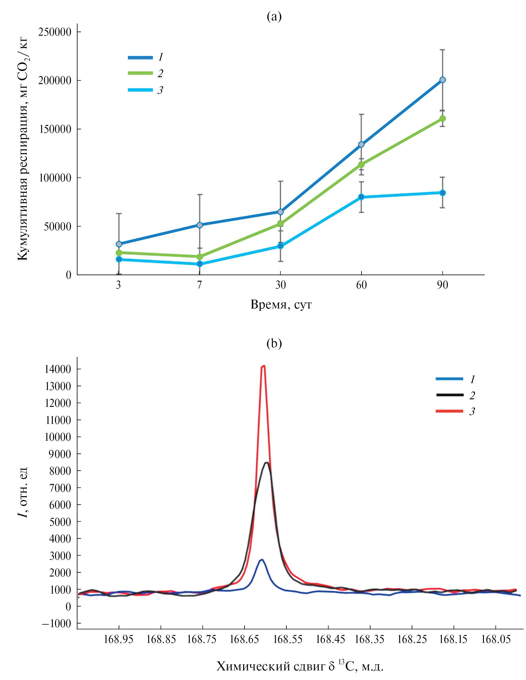 Рис. 4. (a) – Кумулятивная респирация почвы верхнего слоя контрольных почвенных колонок (КT1a) (1), колонок с биочаром (ВT1a) (2), колонок с биочаром и внесенными микроорганизмами деструкторами (DT1a) (3); (b) – 13C ЯМР-спектры уловленного щелочью СО2, выделившегося из верхнего почвы слоя, контрольных почвенных колонок КT1a (1), колонок ВT1a с биочаром (2), колонок DT1a с биочаром и внесенными микроорганизмами деструкторами в течение 3 сут (3).