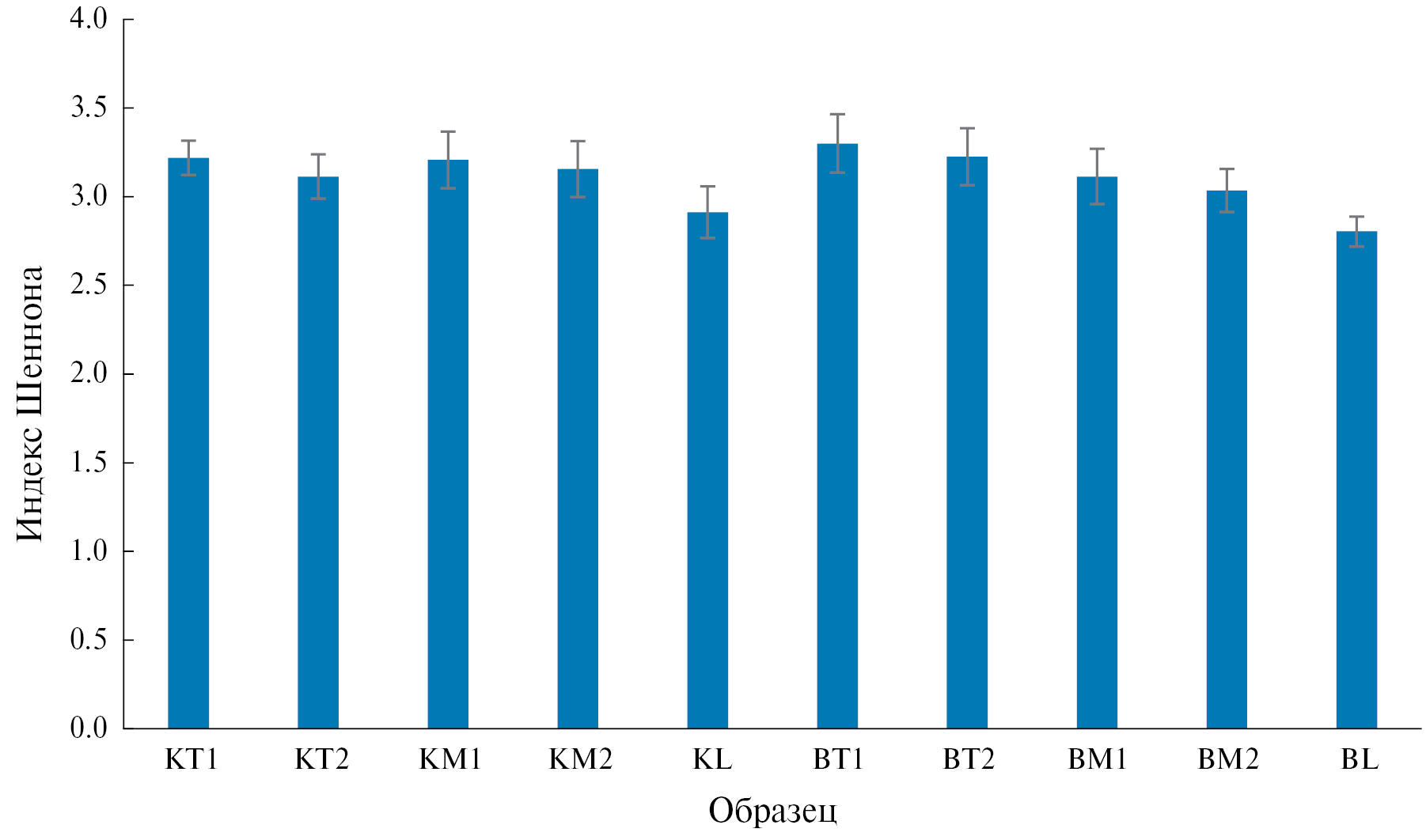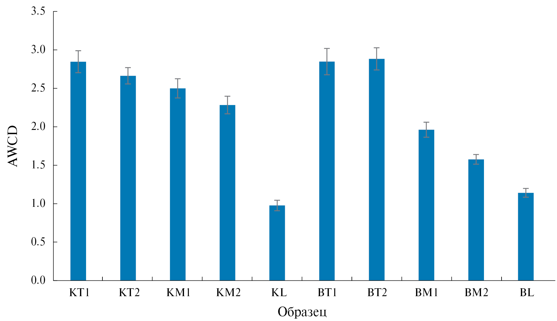 Согласно полученным данным, в контрольных образцах метаболическая активность (AWCD) уменьшалась от верхнего слоя почвы KT1 (2.84) к нижнему KL (0.97). Данная тенденция соответствует литературным данным и отражает различающиеся общее количество и активность микроорганизмов в почвенных слоях [5]. Внесение биочара не привело к достоверным изменениям метаболической активности микроорганизмов в образцах, отобранных в соответствующих слоях. Аналогичное отсутствие достоверных различий контрольных образцов от таковых с мелиорантом наблюдалось и для индекса Шеннона. Действительно, биочар, в отличие от других видов органических удобрений, таких как компост, не приводит к взрывообразному изменению активности почвенных микроорганизмов, напротив, он является медленнодействующим мелиорантом, приводящим к постепенному сдвигу в составе сообществ, но не изменяющим его кардинально. Такое мягкое воздействие биоугля на микробные сообщества на фоне стимулирующего эффекта на рост и развитие растений, а также возможность секвестрации углерода оценивается исследователями как его преимущество по сравнению с другими видами удобрений [28, 30, 38, 55].