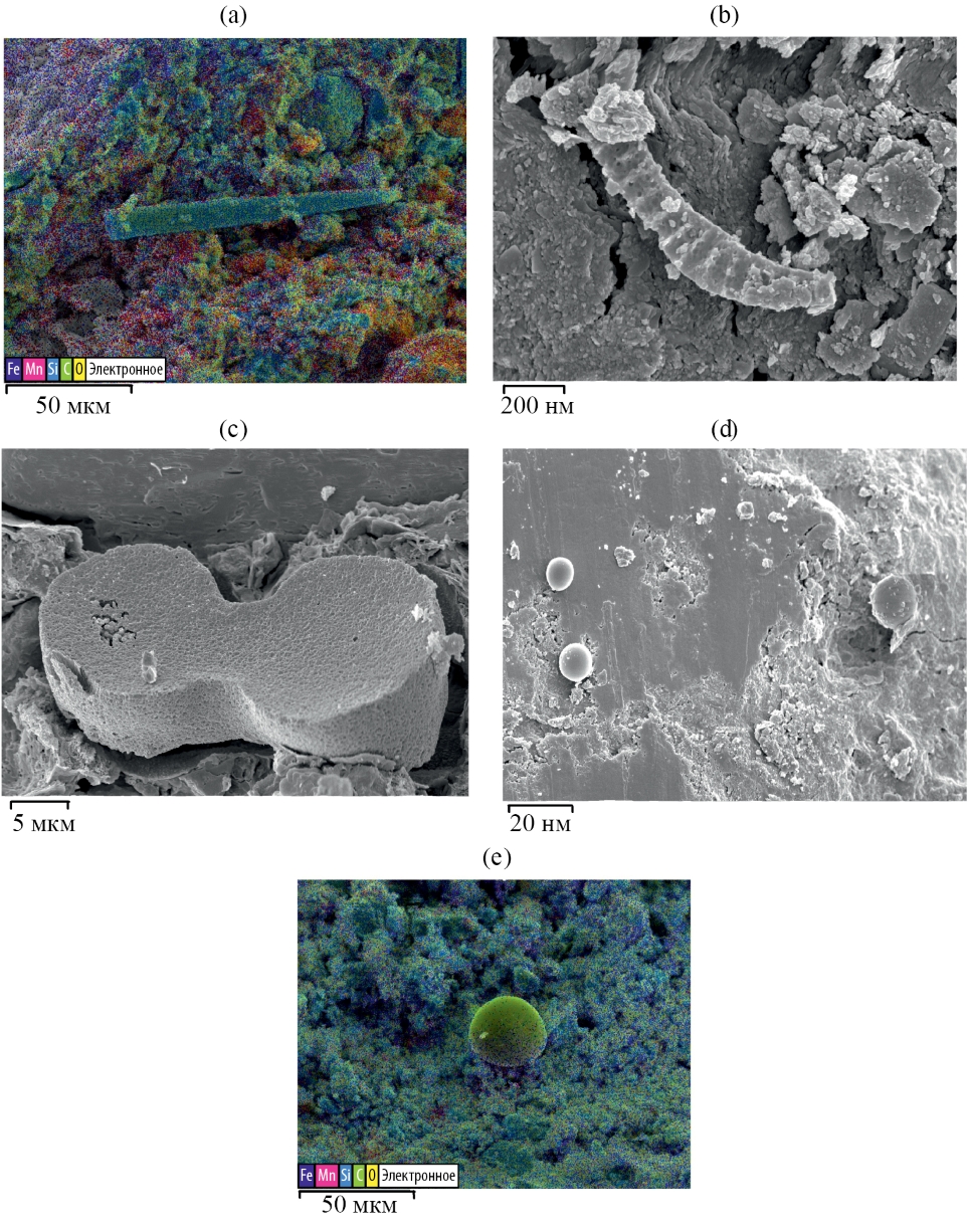Рис. 3. Микрофотографии структур в ядрах ортштейнов: (а) – Si-обогащеннная структура удлиненной формы, (b), (с) – панцири диатомовых водорослей, (d), (е) – сфероидальные структуры.
