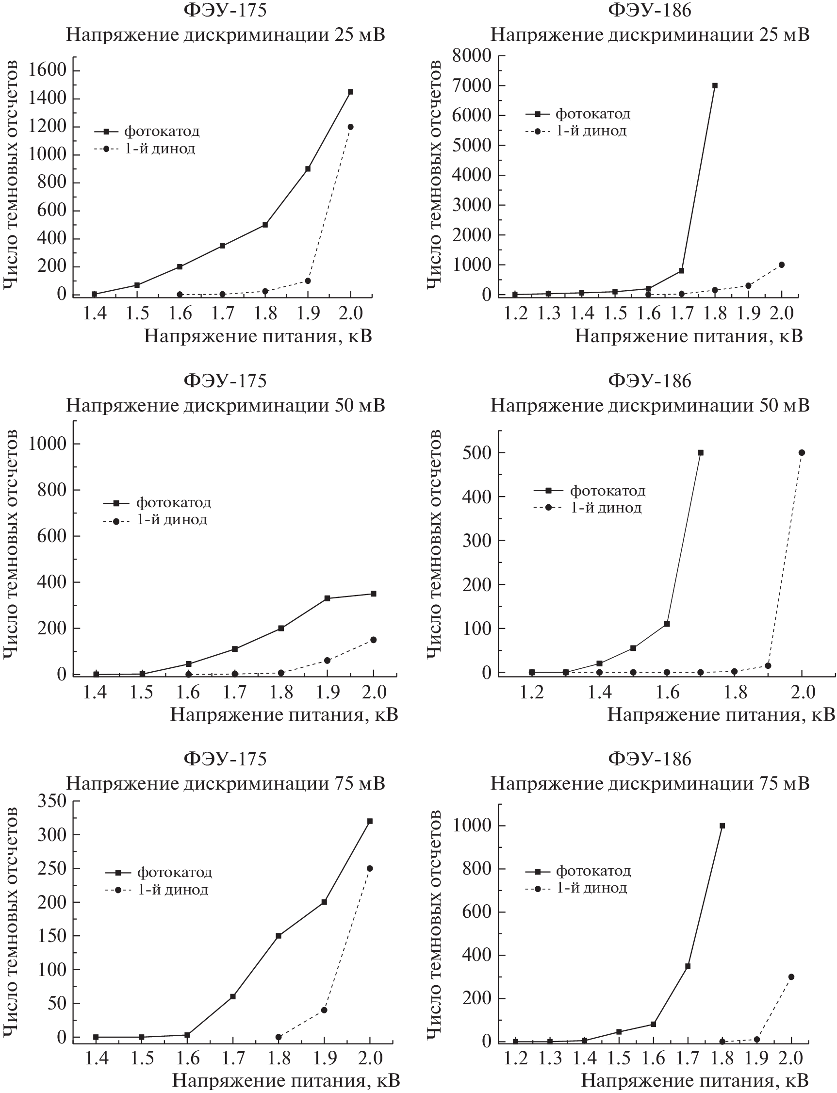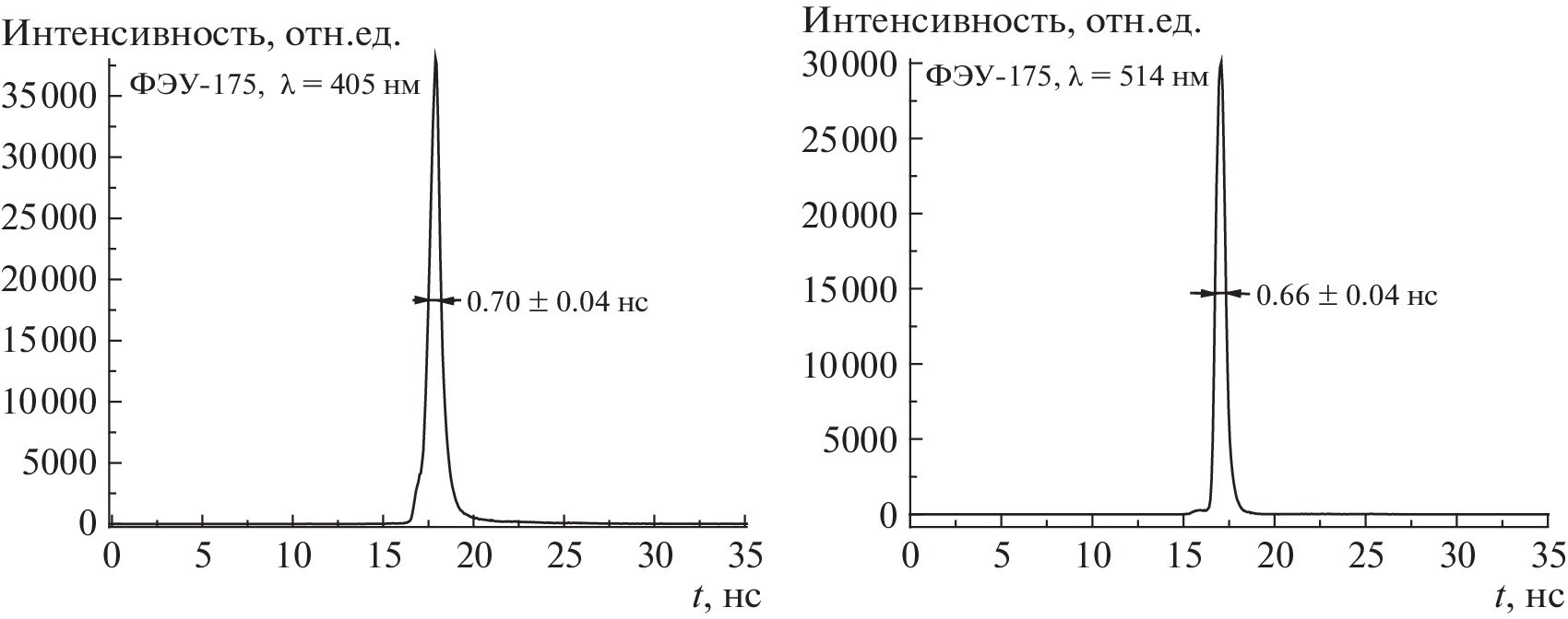 The results from studying the time characteristics (counting, amplitude distributions of single-electron pulses, spread of the signal propagation time (jitter) when exposed to radiation from picosecond diode lasers in the spectral range 405–780 nm) of high-speed photomultipliers FEU-175 and FEU-186 manufactured by AO Central Research Institute Electron (St. Petersburg). FEU-175 and FEU-186, respectively, are equipped with bialkali and multialkali photocathodes; their operating spectral range is 250–650 and 250–800 nm, respectively. Signal amplification is provided by a 14-dynode multiplication system, while the rise time of the PMT impulse response does not exceed 1.5 ns and the jitter is approximately 0.4 ns. PMT data can be used as photodetectors in single-quantum kinetic spectrometers with subnanosecond resolution and in other high-speed optoelectronic recorders.