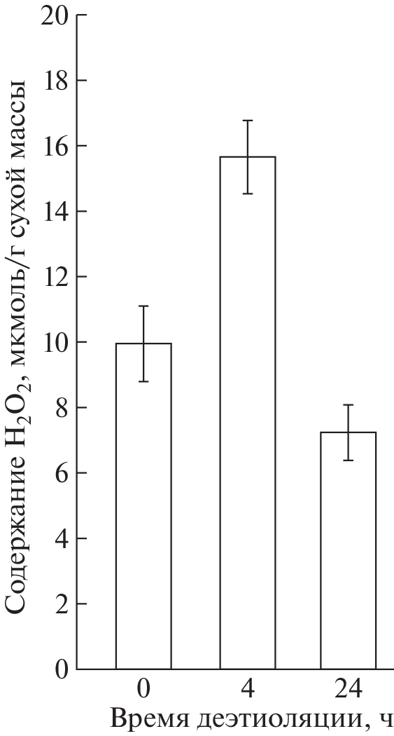 The device and principle of operation of a luminometer designed to determine the concentration of hydrogen peroxide in aqueous solutions by measuring the intensity of the light flux are described. The key points to which attention should be paid in the manufacture of the device are indicated. The results of laboratory tests are described, according to which, in the range of hydrogen peroxide concentrations from 0.12 to 1.95 × 10−6 М, the linear dependence (r2 = 0.97) of signal intensity from H2O2 concentration is preserved. The results of measuring the content of hydrogen peroxide in wheat leaves during deetiolation are presented.