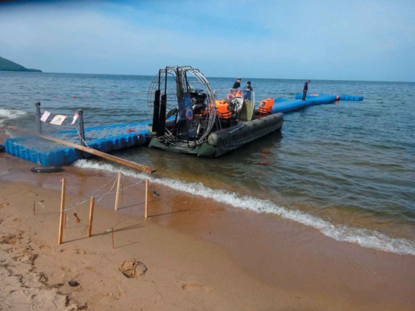 On the Lake Baikal coastline (near the village of Goryachinsk), an installation for studying the relationships between wave hydrodynamic and electrical processes was tested. The equipment and measurement technique are considered. The results of measurements under various conditions of the wave process are presented. The physics of the phenomenon belongs to the class of hydroelectrokinetic effects. The natural filtration electric field is associated with the movement of the incoming water wave in porous sand. An electric field is formed inside the porous structure of sand when freshwater moves through it.