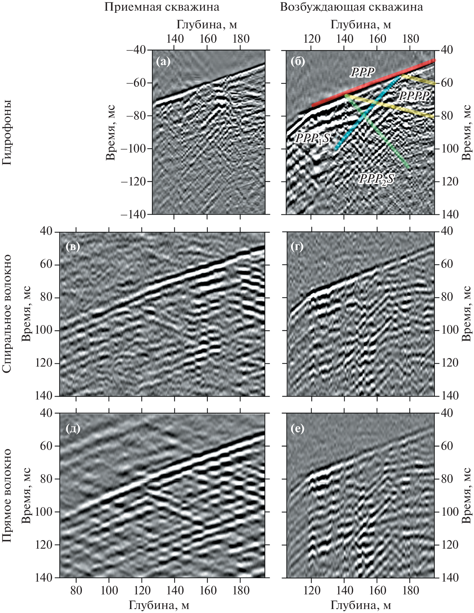 To expand the possibilities of solving geophysical problems using fiber-optic distributed systems for recording acoustic waves, a comparison was made of the signals obtained by traditional hydrophones and a distributed fiber-optic system using a cable containing straight and helical fibers. The studies were carried out by the method of cross-well seismic survey. The possibility of separating direct and refracted head waves recorded by a distributed fiber-optic system and using them to obtain geological and geophysical information about the state of the massif is considered. It is shown that, when using a helically wound fiber, the first arrivals of a direct longitudinal wave can be traced to conduct cross-well seismic of the rock massif and evaluate the velocity distribution by the method of cross-well time-travel tomography on direct waves. For both straight and helical fibers, the stacking of the head waves makes it possible to obtain sufficiently clear arrivals of the head wave even in the dry part of the well and use it to determine the velocities of compressional waves of the near-borehole massif. The composition of the cross-well wave field depends on the radiation patterns of both the source and the receiver of acoustic waves. The use of multiple overlap systems makes it possible to vary the composition of the recorded wave field due to the mutual arrangement of the receiving and exciting lines depending on the tasks being solved.