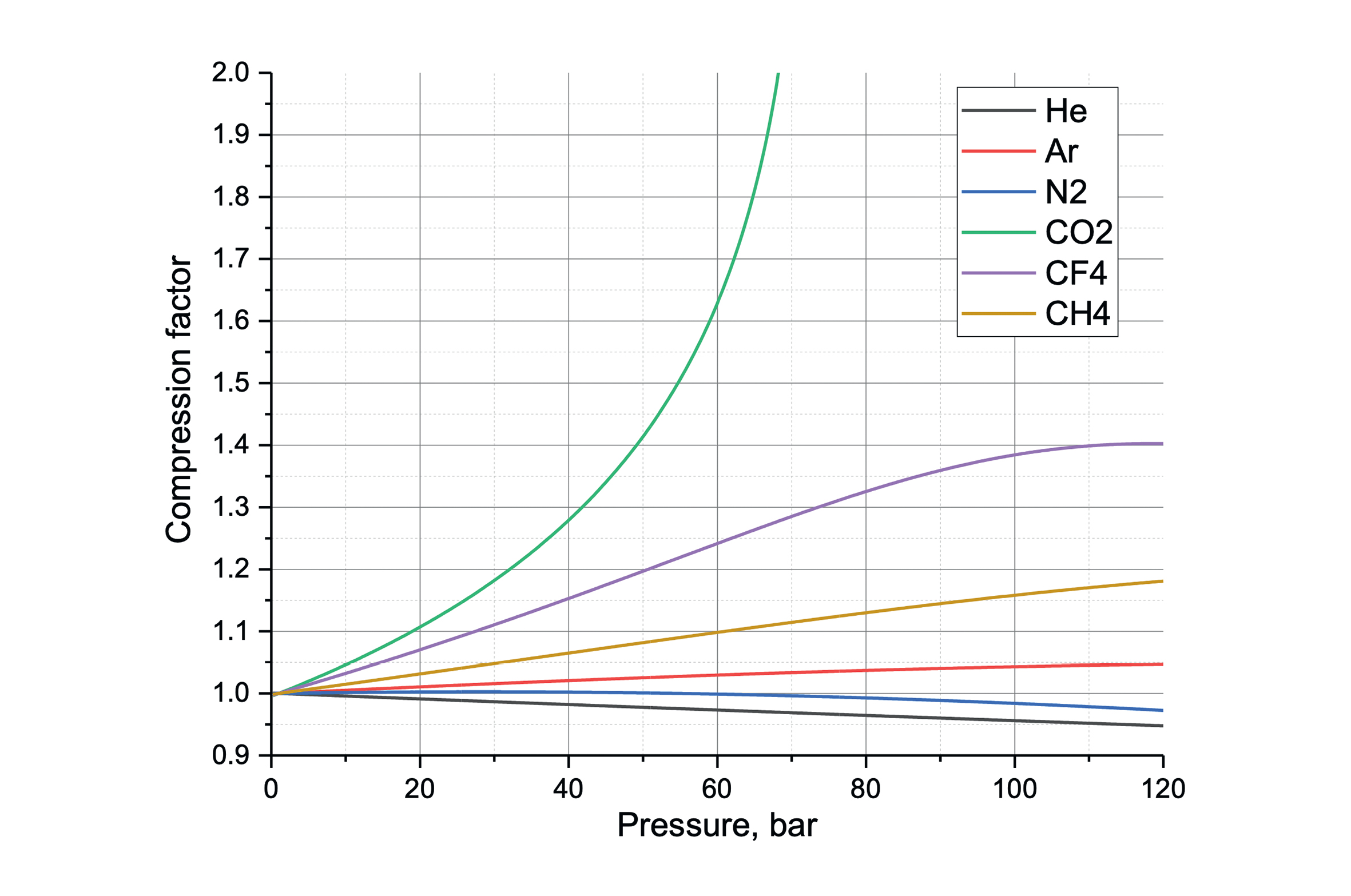 Статическое смешение проводится с помощью компьютера в ручном или полуавтоматическом режимах с учетом значений парциального давления смешиваемых компонентов. Следует отметить, что для точного приготовления смеси необходимо учитывать коэффициенты сжимаемости исходных газов [1], которые даже при небольших давлениях отличаются от таковых для идеального газа (рис. 3). Поскольку изотермический процесс смешения происходит при постоянной температуре, требуемая плотность газа определяется из плотности газа при давлении 1 бар и температуре термостатирования с учетом процентного содержания газа в смеси и конечного давления смеси. Из полученной плотности по справочным данным [2, 3] вычисляется требуемое парциальное давление газа. Таким образом рассчитываются парциальные давления компонентов для массового смешения.