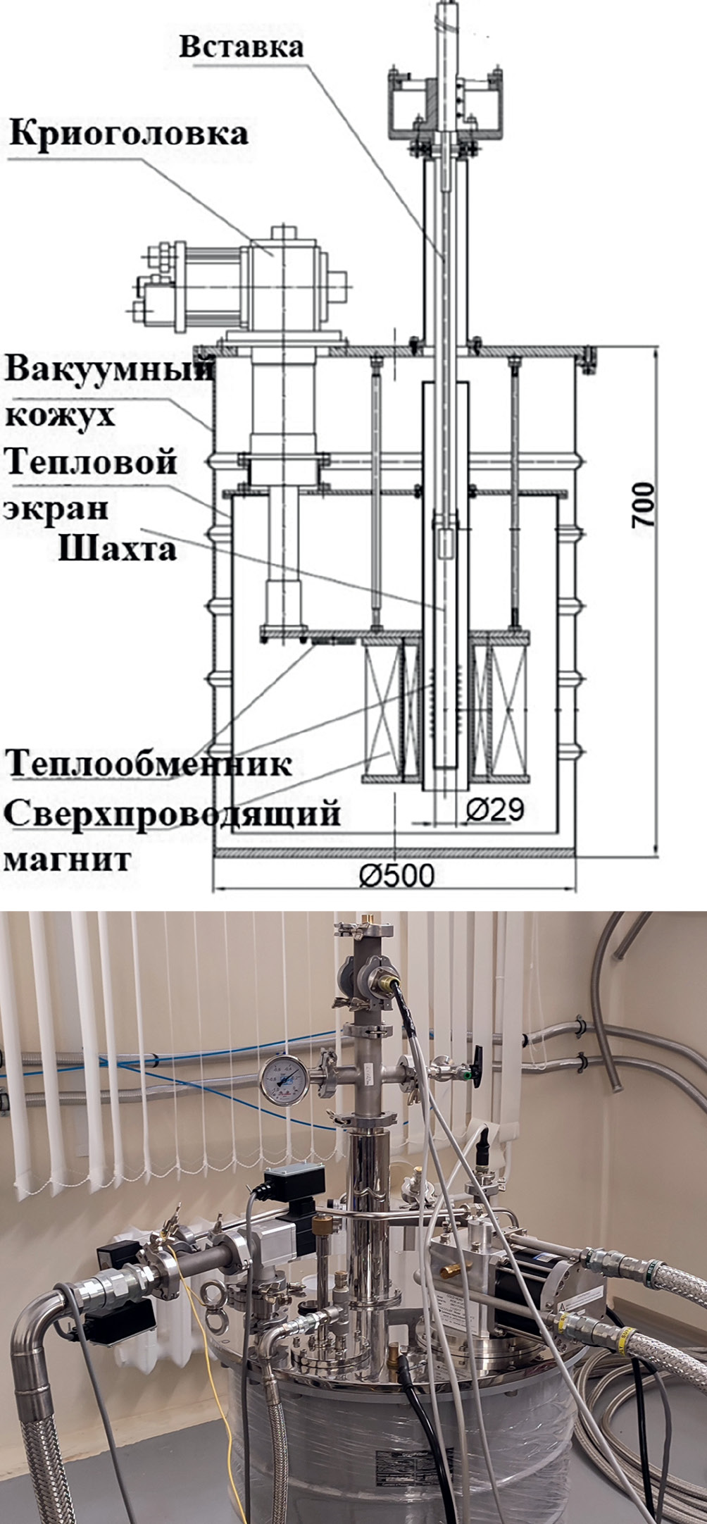 Рис. 5. Криостатирующая система GFSG-510-2K-SCM10T-VTI29 (ООО “Криотрейд инжиниринг”) со сверхпроводящим магнитом и ее схема.