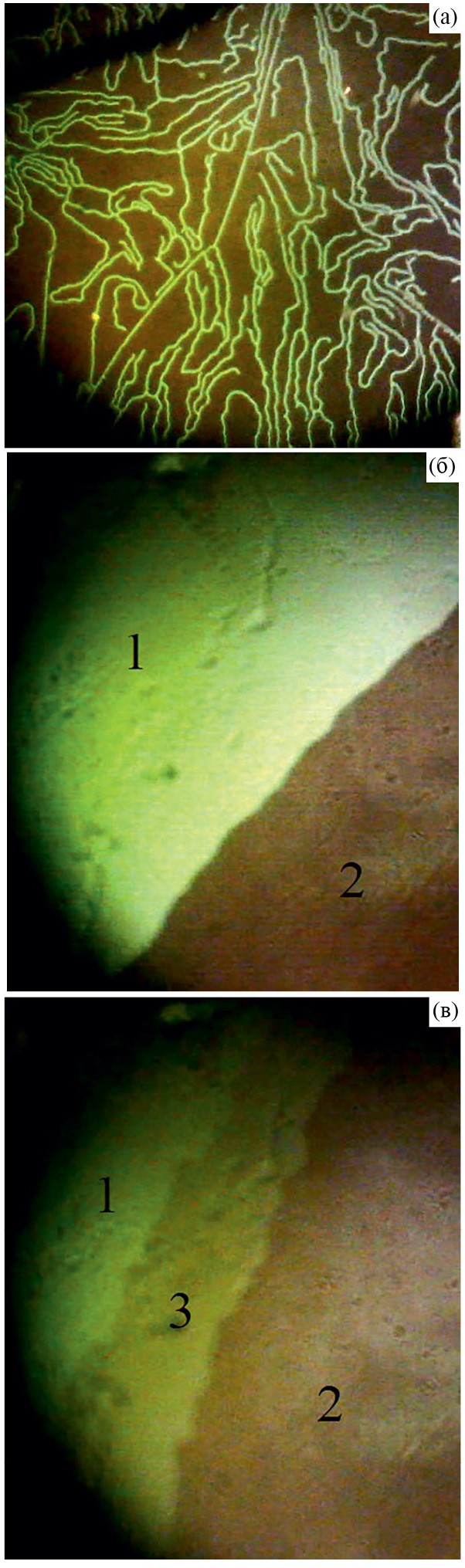 Рис. 6. а) Домены в отсутствие внешнего магнитного поля. б) Коллинеарные фазы разной направленности (области 1, 2) во внешнем магнитном поле 0.5 Тл в области магнитной компенсации. в) Магнитные фазы во внешнем магнитном поле 1 Тл в области магнитной компенсации: области 1, 2 – коллинеарные фазы противоположной направленности, область 3 – неколлинеарная фаза.