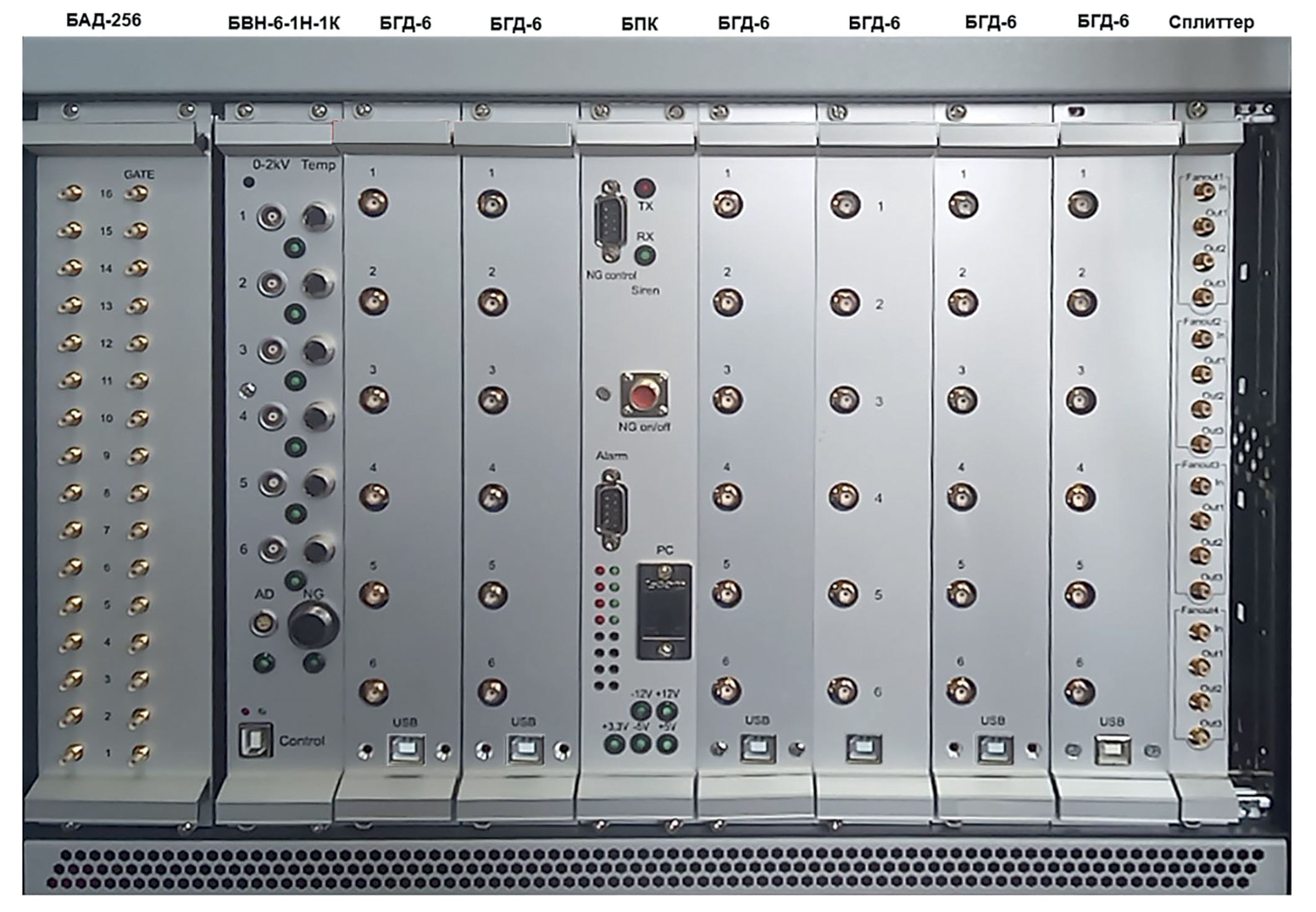- модуль гамма-каналов БГД-6 с шестью входами для регистрации сигналов с гамма-детекторов и событий (альфа-гамма-совпадений);