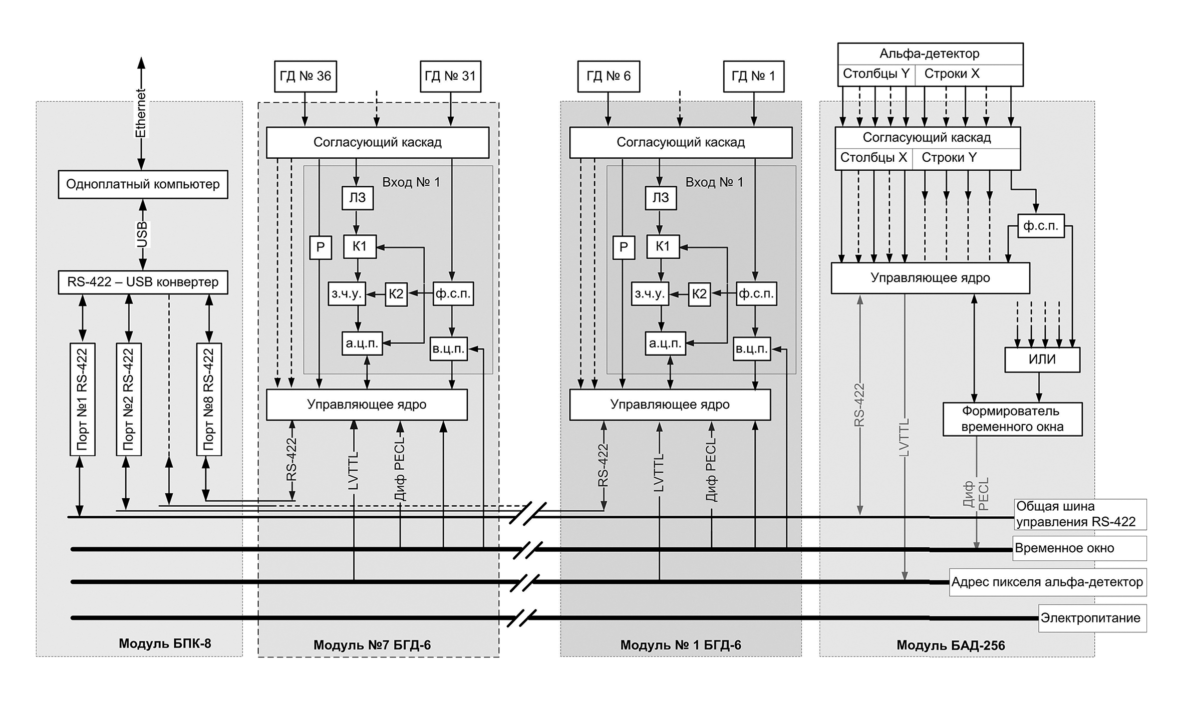 - модуль альфа-каналов БАД-256 с 32 входами (16 X-входов и 16 Y-входов) для выработки временных ворот и регистрации номера сработавшего пикселя альфа-детектора;