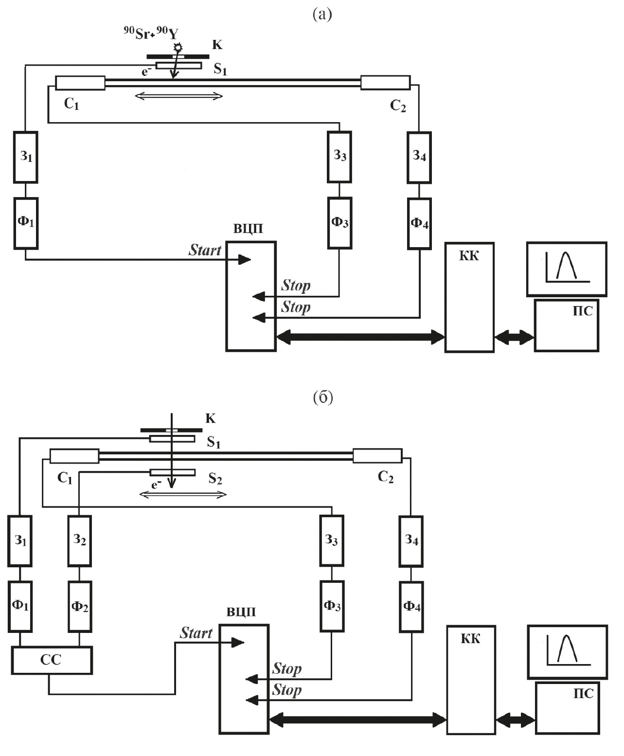 Рис. 3. Схемы калибровки СВПГ: а – калибровка с помощью радиоактивного источника; б – калибровка с помощью вторичного электронного пучка. S1 и S2 – триггерные сцинтилляционные счетчики; K – свинцовый коллиматор; C1, C2 – каналы СВПГ; З1–З4 – блоки временных задержек; Ф1–Ф4 – блоки формирователей со следящим порогом; СС – схема совпадений; ВЦП – время-цифровой преобразователь; Start – сигнал запуска блока ВЦП; Stop – временные сигналы с каналов C1 и C2 СВПГ; KK – крейт-контроллер системы CAMAC; ПС – персональный компьютер.