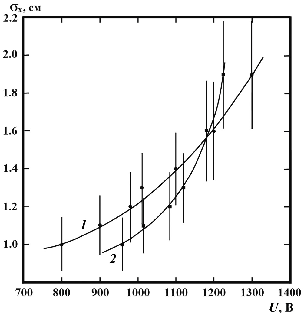 На рис. 5 представлены зависимости координатного разрешения модуля СВПГ (σx) от напряжения на делителях напряжения ФЭУ (1 – левого, 2 – правого) при положении радиоактивного источника по центру модуля x = 0. Диаметр коллиматора K на данном и последующих рисунках вычтен. Видно, что с увеличением напряжений на делителях напряжений ФЭУ координатное разрешение СВПГ ухудшается. Можно предположить, что хорошее координатное разрешение (σx ≈ 1.0 – 1.2 см) при относительно небольших напряжениях (U ≈ 800–1100 В) связано с регистрацией ФЭУ прямого света от электронного трека в сцинтилляторе модуля, т. е. в общем количестве регистрируемого света величина света, связанного с внутренним отраженным светом от граней сцинтилляционной пластины, небольшая. При увеличении напряжения (U > 1100 B) ФЭУ начинают регистрировать более слабый отраженный свет и, несмотря на увеличение общей величины отраженного света, число флуктуаций в поглощении света модулем увеличивается, что ведет к увеличению неточности в определении координаты точки регистрации электрона.