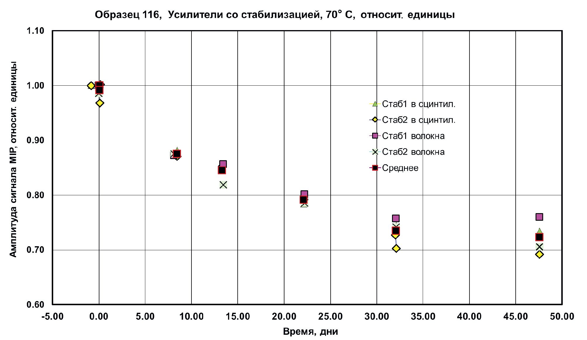 Рис. 2. Зависимость амплитуды сигналов MIP от счетчика № 116 от времени при температуре 70 ˚C для ускоренного старения. Стаб1 и Стаб2 – сигналы с различных полос сцинтиллятора с использованием усилителей со стабилизацией температурной зависимости усиления; “в сцинт” и “волокна” – измерения, отличающиеся деталями ввода калибровочного сигнала от светодиода.