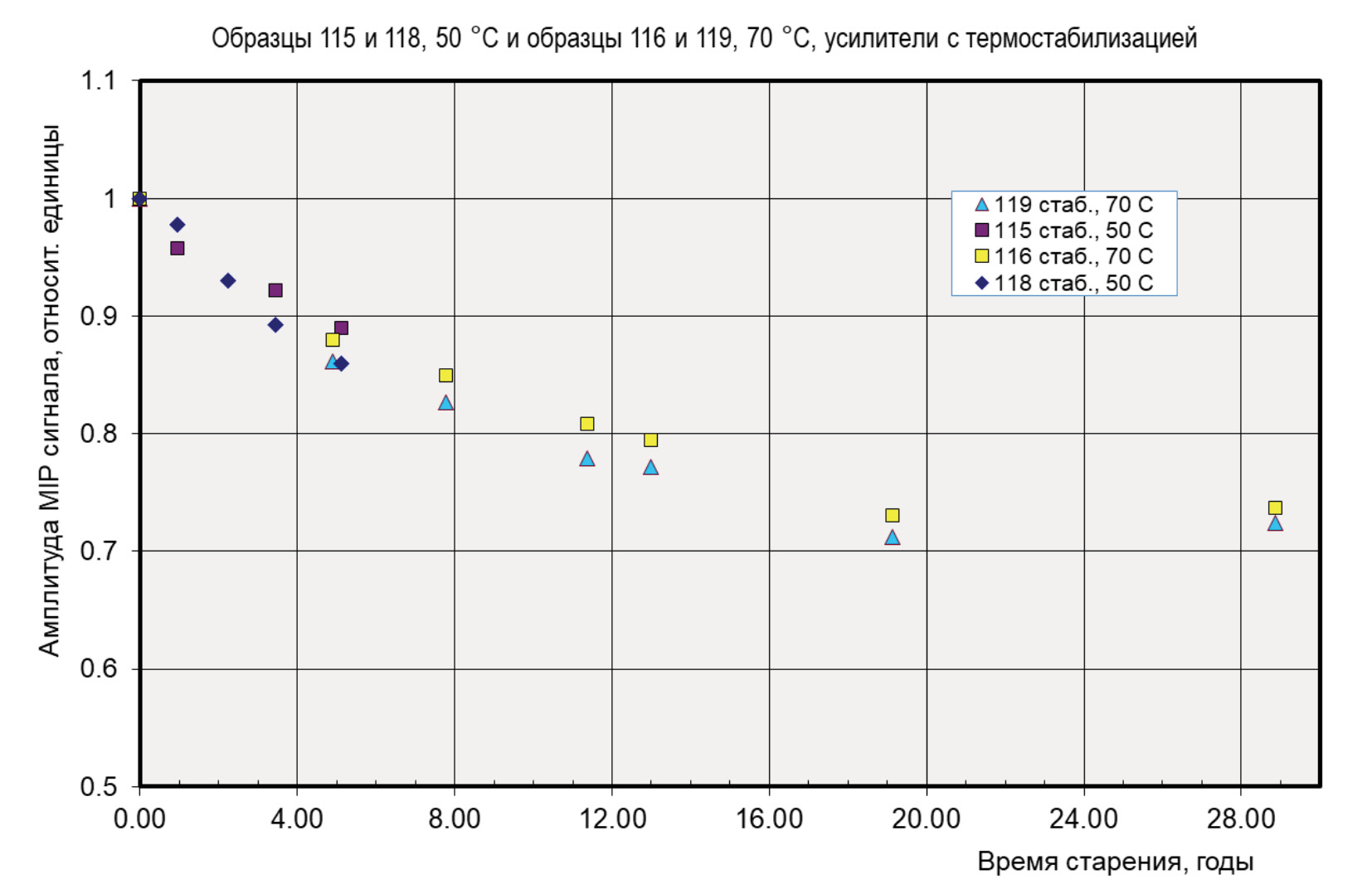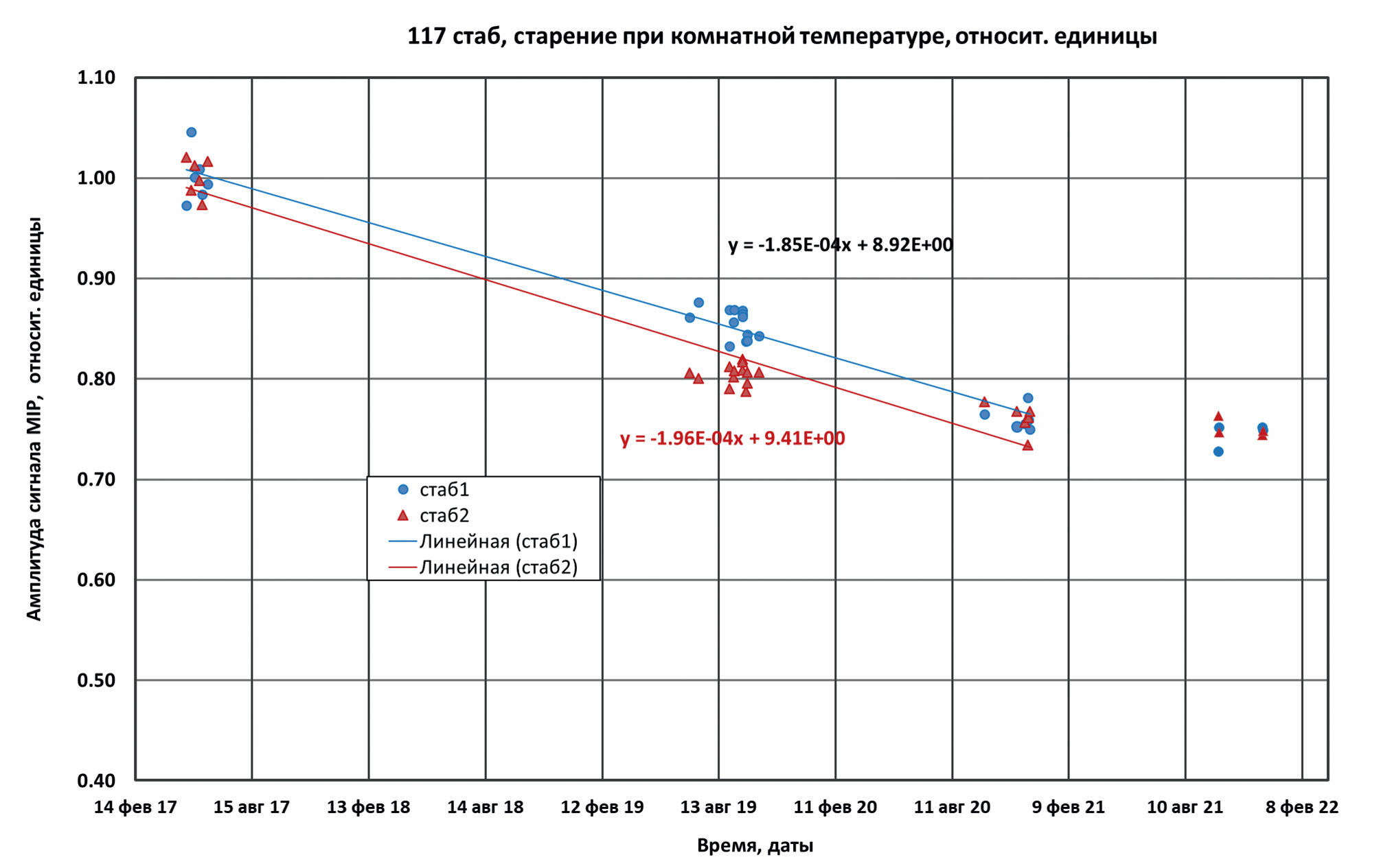 Два прототипа, каждый из которых содержит два изолированных друг от друга по сбору света полос сцинтиллятора, были в 2017 году подвергнуты ускоренному старению с выдержкой в течение 53 дней в термостате при температуре 70 ˚C, что было эквивалентно старению в течение 30 лет при температуре 20 ˚C (рис. 3). Сигнал сцинтиллятора за это время уменьшился до уровня около 70% от первоначального уровня и далее практически не изменялся в течение 2.5 лет. После этого, в конце 2019 года, эти же образцы были подвергнуты новому сеансу ускоренного старения выдержкой в термостате при температуре 70 ˚C с перерывами для измерений, в течение 20 дней, что было эквивалентно старению в течение 13 лет при температуре 20 ˚C. Результаты измерений всех 4 счетчиков показали стабильные амплитуды сигналов от мюонов, старение сцинтиллятора не превышало 0.5% в год при температуре 20 ˚C (рис. 5, 6).