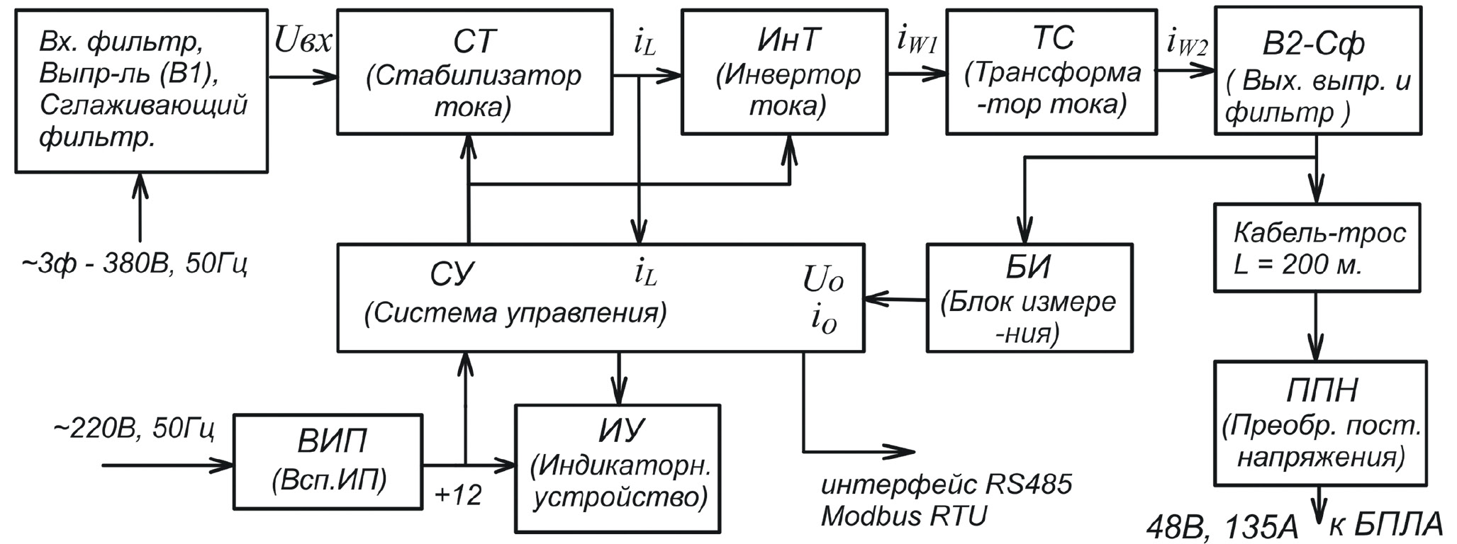 Структурная схема блока питания показана на рис. 1. Вся система питается от стандартной трехфазной сети напряжением 380 В частотой 50 Гц. В мобильном исполнении сетевое напряжение формируется от вспомогательного дизель-генератора. Входное сетевое напряжение через входную коммутационную и защитную аппаратуру, а также входной фильтр, подавляющий помехи, поступает на модуль трехфазного мостового выпрямителя и далее на выходной Г-образный LC-фильтр. Практически постоянное нестабилизированное напряжение на выходе фильтра порядка 500 В поступает на стабилизатор тока (СТ) на основе транзисторного ключа и реактора L1, который обеспечивает стабилизацию и регулировку тока , поступающего на вход мостового инвертора тока (ИнТ). Величина этого тока определяет значение выходного напряжения, прикладываемого к нагрузке в виде кабель-троса и источника питания БПЛА. Инвертор тока работает с коэффициентом заполнения, равным 0.5, не участвуя в процессе регулирования и стабилизации выходного напряжения. Его функция заключается в формировании переменного тока для обеспечения трансформаторной развязки и согласования уровня выходного напряжения с уровнем входного. Таким образом, переменный ток инвертора поступает на первичную обмотку согласующего трансформатора (ТV), который обеспечивает также гальваническую развязку выходной цепи от питающей сети. Для формирования постоянного выходного напряжения используется блок В2-Сф на основе мостового выпрямителя В2 и емкостного фильтра Сф. Отсутствие выходного дросселя ограничивает выброс напряжения на выходных диодах, вызванный энергией индуктивности рассеяния трансформатора на уровне текущего выходного напряжения. Выходное напряжение наземного блока Uвых поступает через кабель-трос длиной 200 м на вход источника питания БПЛА, который представляет собой шестифазный преобразователь постоянного напряжения (ППН). Источник питания БПЛА формирует выходное стабилизированное напряжение 48 В с током нагрузки до 135 А для питания электроприводов и системы управления БПЛА.