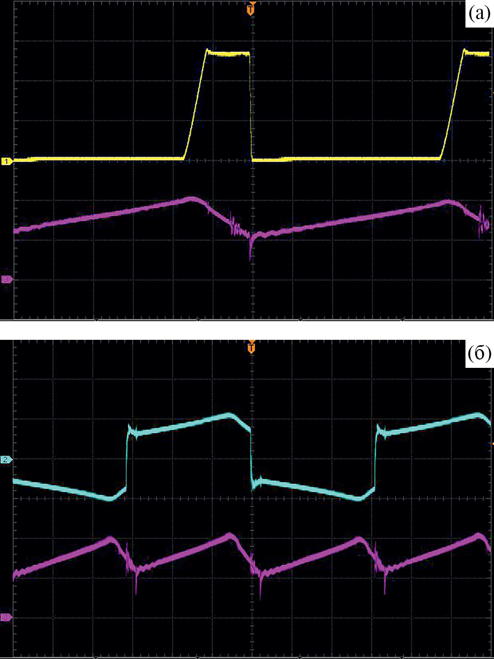Рис. 5. Осциллограммы напряжения на транзисторе стабилизатора тока T1 (верхняя кривая, 200 В/дел) и тока дросселя IL1 (нижняя кривая, 9.8 А/дел), 5 мкс/дел (а), тока первичной обмотки трансформатора (верхняя кривая, 18.5 А/дел) и тока дросселя IL1 (нижняя кривая, 9.8 А/дел), 10 мкс/дел (б).