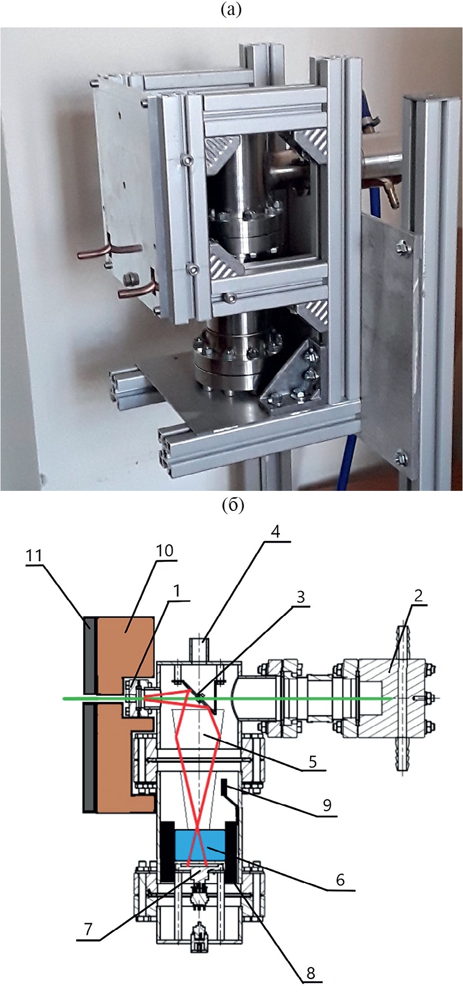 Рис. 3. Фотография (а) и схематический чертеж (б) камеры взаимодействия: 1 — входная титановая фольга толщиной 50 мкм, 2 — охлаждаемый цилиндр Фарадея, 3 — зеркало, отражающее ИВЧ, 4 — штуцер для подачи газа, 5 — зеркальный конус (фокон), собирающий ИВЧ, 6 — радиационно-стойкое стекло, 7 – фотодиод PIN-25-DP, 8 — свинцовая защита фотодиода от внешнего потока рентгеновских лучей, 9 — датчик температуры, 10 — слой графита, 11 — охлаждаемая алюминиевая плита.