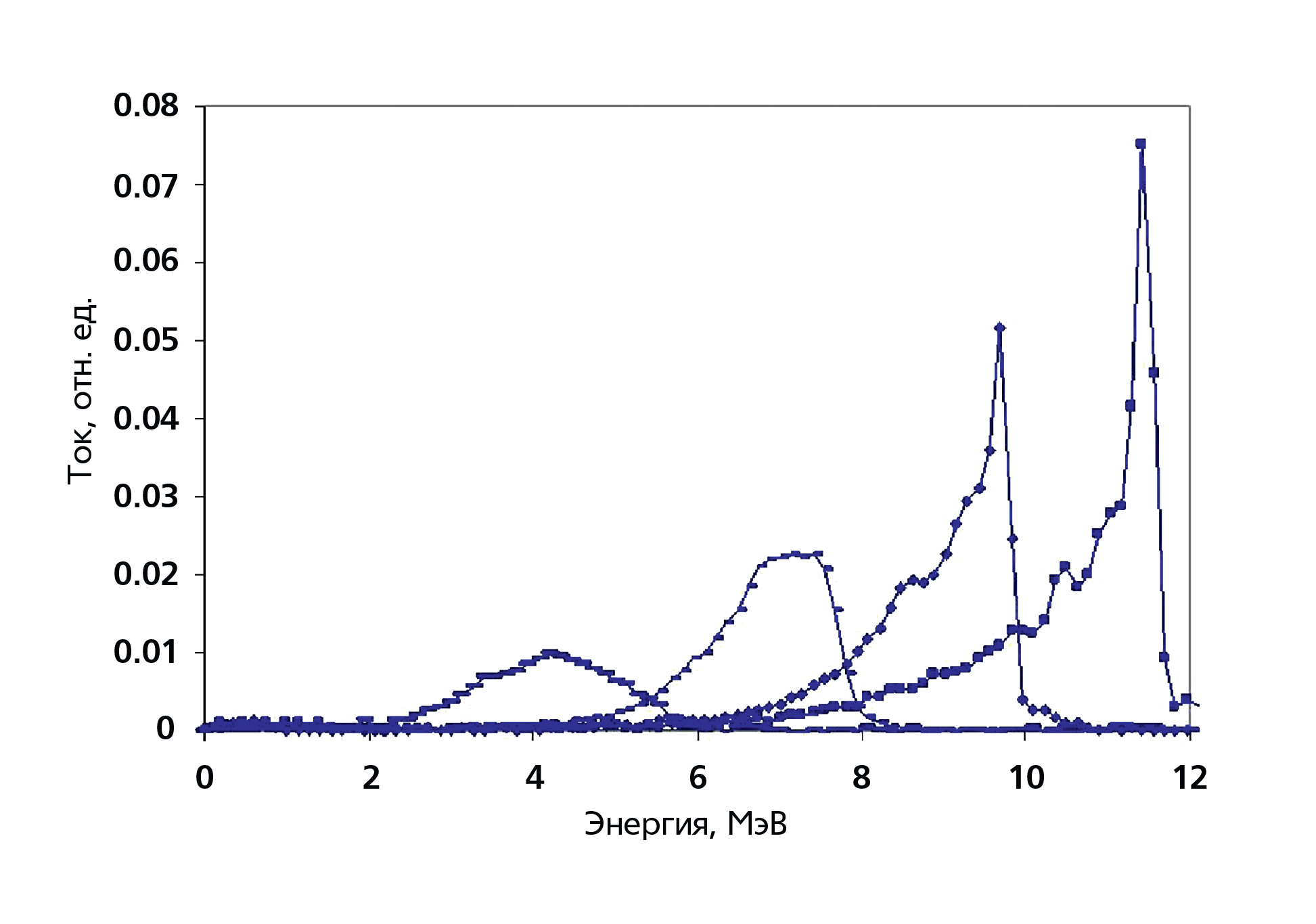 Рис. 5. Спектры ускоренного пучка электронов линейного ускорителя при различных уровнях ускоряющего поля [12].