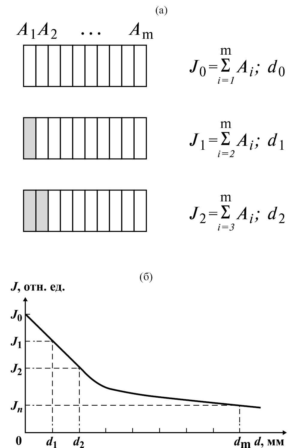 Рис. 2. а) Алгоритм измерения кривой ослабления: Ji – поглощенная энергия, di – толщина фильтра, Аi – сигнал с детектора. б) Кривая ослабления, построенная на основе этого алгоритма.
