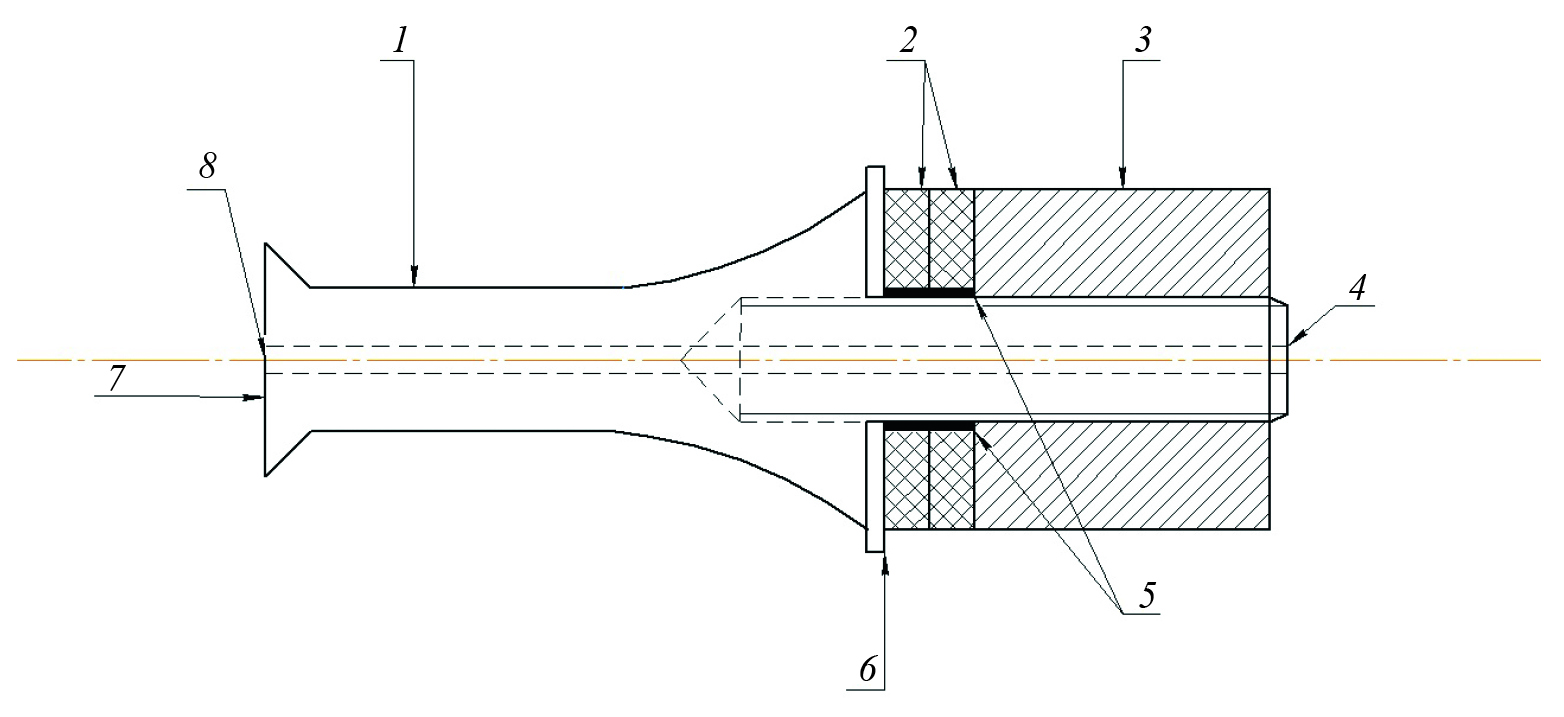 Рис. 1. Схема УЗКС: 1 – концентратор, 2 – пьезоэлементы, 3 – отражающая накладка, 4 – стягивающая шпилька, 5 – изолирующая втулка, 6 – поясок крепления, 7 – рабочий инструмент, 8 – канал подачи воды.
