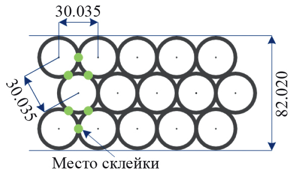 Камера представляют собой сборку из 144 дрейфовых трубок, склеенных в три параллельных слоя по 48 трубок и подключенных к системе сбора данных [26]. Средний ряд трубок смещен на половину диаметра трубки, расстояние между центрами любых двух соседних трубок в камере и в плоскости составляет 30.035 мм (рис. 4). Аналогичные по конструкции камеры из дрейфовых трубок используются на установке мюонного спектрометра ATLAS на большом адронном коллайдере (ЦЕРН, г. Женева) [27].