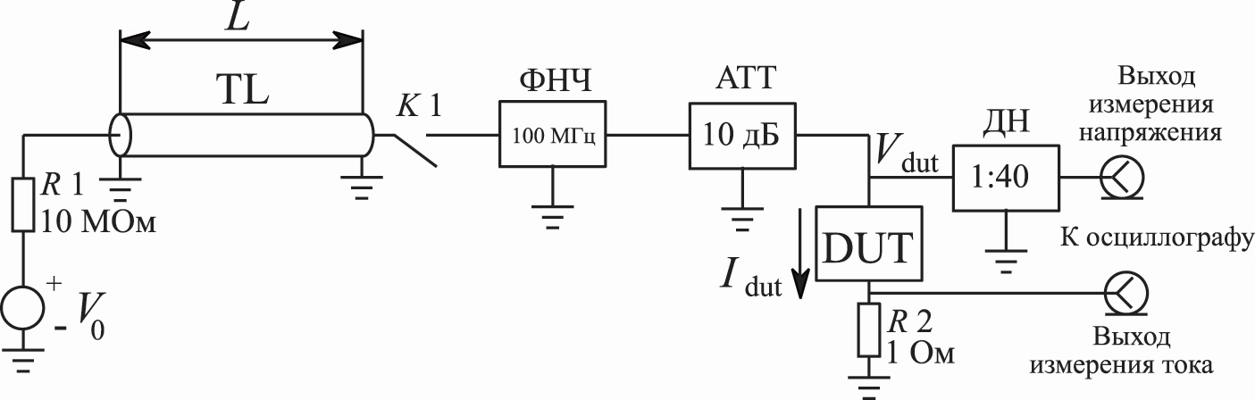 Разработанная установка реализует измерение импульсных ВАХ методом TLP [6–8]. Данный метод основан на том, что коаксиальный кабель, заряженный от источника постоянного тока до некоторого напряжения, затем разряжается в согласованную цепь, в которую включен исследуемый полупроводниковый компонент (device under test, DUT). При разряде длинной линии в согласованную нагрузку, сопротивление которой равно волновому сопротивлению линии, форма импульса тока разряда будет близкой к прямоугольной. Длительность импульса зависит от длины кабеля, а амплитуда тока разряда – от напряжения высоковольтного источника. Длительность импульса τ определяется из следующего выражения [7]: