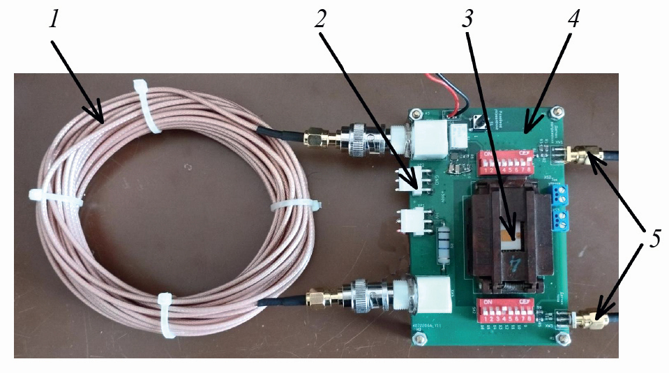 Рис. 3. Установка для исследования стойкости полупроводниковых приборов к воздействию электростатического разряда методом TLP: 1 – отрезок кабеля RG-316 длиной L=10 м, 2 – разъемы для подключения источника высокого напряжения, 3 – контактирующее устройство с установленной ИМС, 4 – модуль на печатной плате, 5 – разъемы для подключения осциллографа.