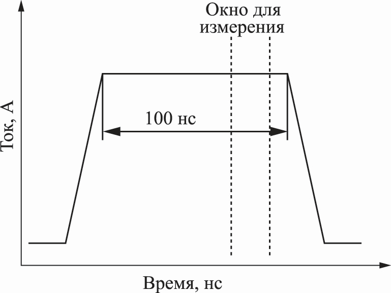 Измерение ВАХ начинаются с того, что на источнике высокого напряжения выставляется минимальное напряжение. Затем инициируется разряд и снимаются осциллограммы тока и напряжения на исследуемом объекте. Определяются значения тока и напряжения в окне 70–90 нс для прямоугольного импульса длительностью 100 нс (рис. 4). Таким образом получаются значения, соответствующие одной точке на ВАХ. Затем напряжение высоковольтного источника повышается последовательно ступенями по 10–25 В до тех пор, пока не произойдет пробой исследуемого компонента или не будет достигнуто предельное напряжение источника. Таким образом получается ВАХ исследуемого электронного компонента. При этом фиксируют предельное значение тока It2, протекающего через защитный элемент. Данное значение может быть пересчитано в напряжение отказа при тестировании по методике модели тела человека HBM с использованием способа, представленного в работе [11].