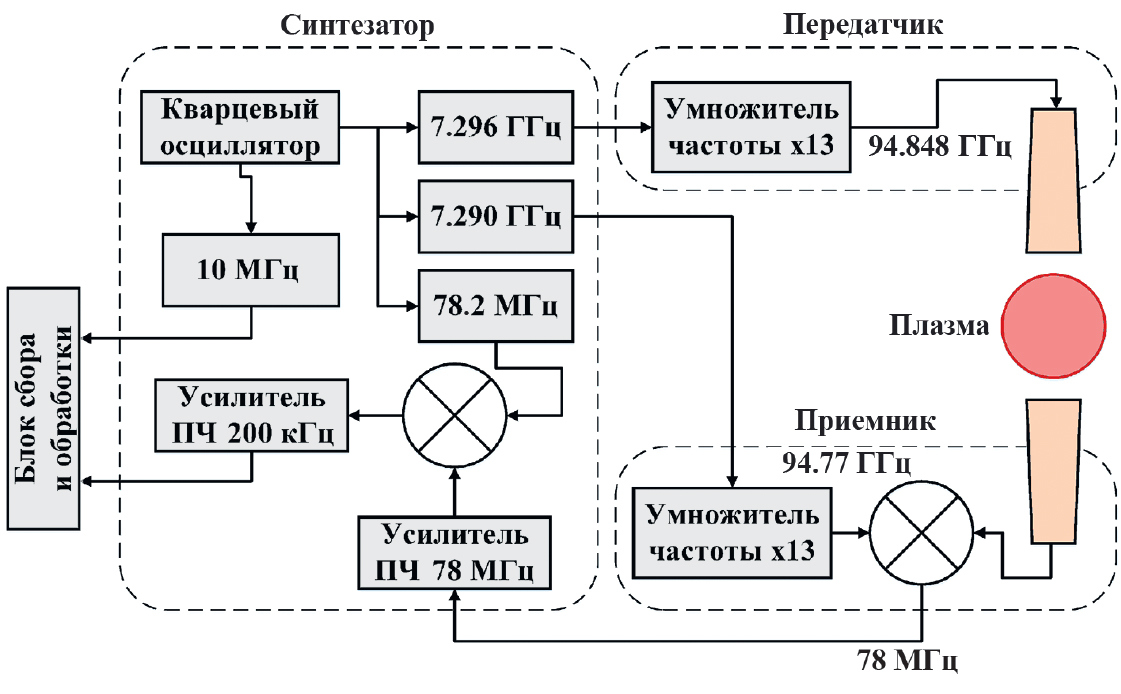 СВЧ-интерферометр, входящий в диагностический комплекс установки ПН-3, позволяет проводить зондирование плазмы обыкновенными волнами на частоте 94 ГГц. Плазменная частота, характерная для плазмы разряда, составляет порядка 30 ГГц, так что формируемая плазма является прозрачной для зондирующего СВЧ-излучения. СВЧ-интерферометр состоит из синтезатора, передатчика и приемника (рис. 2). Синтезатор генерирует от опорного кварцевого осциллятора (КО), fко = 10 МГц, три сигнала с частотами f1 = 7.296 ГГц, f2 = 7.290 ГГц и f3 = 78.2 МГц. Зондирование плазмы осуществляется первым сигналом, частота которого с помощью умножителя частоты предварительно увеличивается в 13 раз (см. рис. 2), так что в результате зондирование проводится на частоте fзонд = 94.848 ГГц (λ = 3.16 мм). Прошедший через плазму зондирующий сигнал поступает на приемник, где смешивается с сигналом с частотой f2 = 7.290 ГГц, также увеличенным по частоте в 13 раз, в результате чего на выходе смесителя формируется сигнал первой промежуточной частоты (ПЧ1) fпч1 = 78 МГц. Далее частота сигнала ПЧ1 понижается путем смешивания с сигналом с частотой f3 = 78.2 МГц. В результате повторного смешивания формируется сигнал второй промежуточной частоты (ПЧ2) fпч2 = 200 кГц.