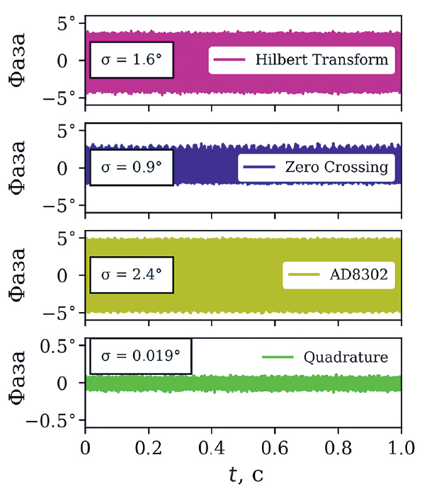 Постоянная времени для метода, основанного на преобразовании Гильберта, определяется частотой оцифровки данных АЦП, для метода по пересечению нуля – несущей частотой (ПЧ2), для AD8302 – фильтрующей емкостью на выходе (1 нФ), для квадратурного демодулятора – постоянной времени фильтрующей RC-цепочки ФНЧ. Систематическая ошибка для цифровых методов постобработки (с преобразованием Гильберта и по пересечению нуля) обусловлена не самим методом, а систематической ошибкой используемого повторителя сигналов. Для AD8302 систематическая ошибка, которую можно видеть на рис. 9, определена из нелинейности сигнала, для метода квадратурной демодуляции – из нелинейных эффектов при максимальной частоте расстройки в эксперименте, Δf = 2 кГц.