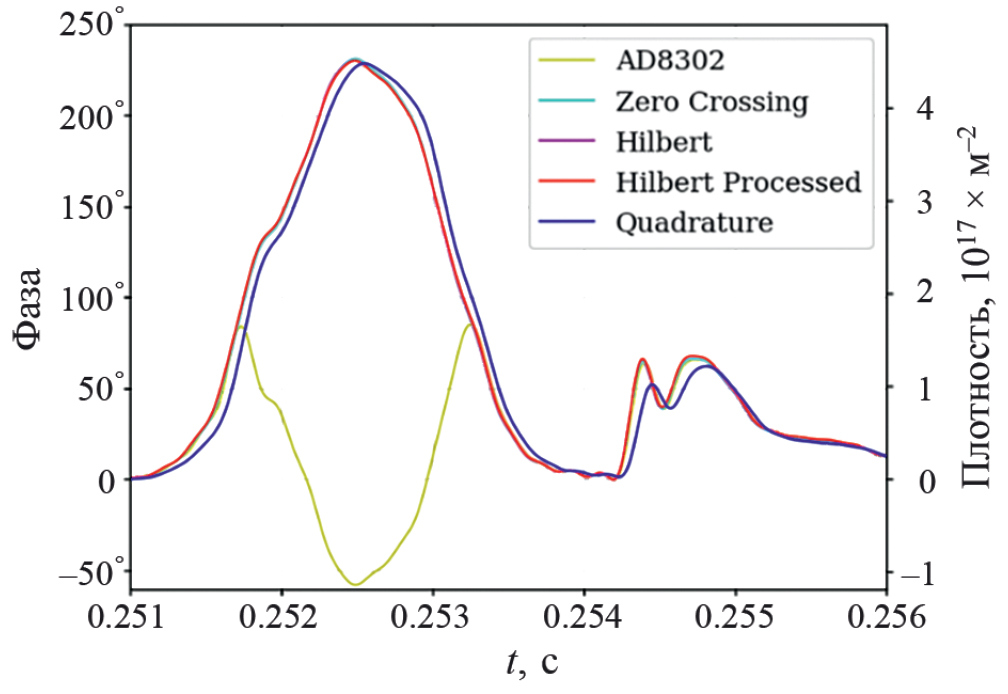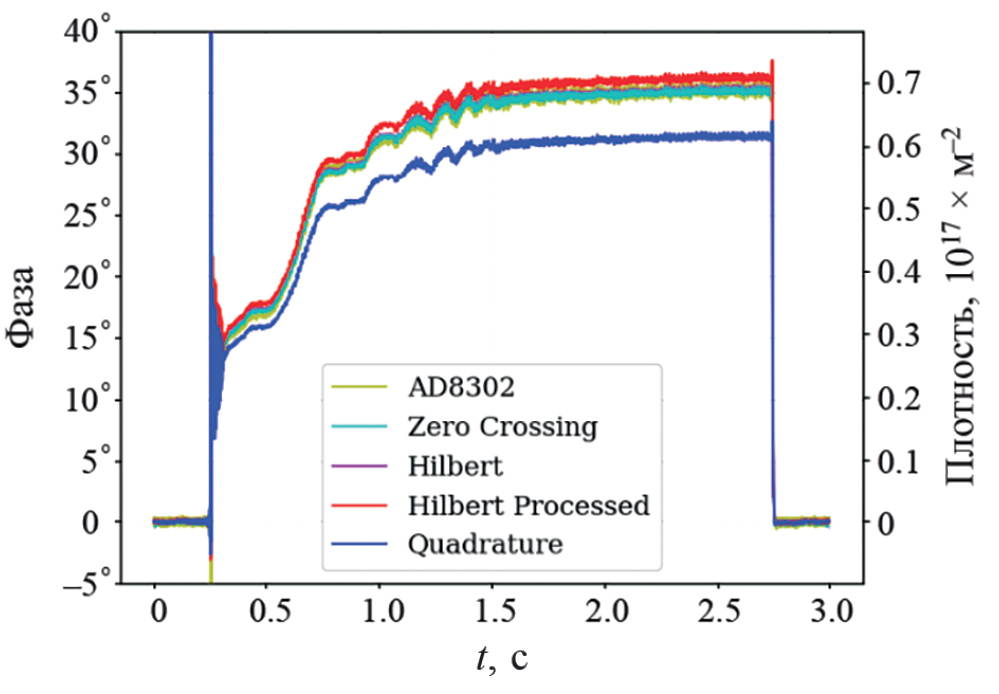 Пример эволюции электронной плотности в ходе плазменного разряда на стенде ПН-3 представлен на рис. 10. Красной линией показан результат вычисления фазы с помощью преобразования Гильберта и компенсации систематической ошибки. Алгоритм вычисления систематической ошибки соответствовал описанному в предыдущем разделе.