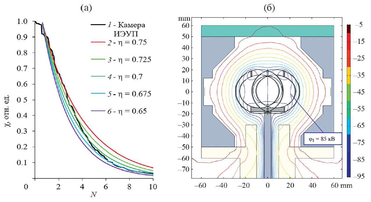 Анализ параметров камеры ИЭУП проводился с использованием подхода, описанного в статье [9]. Для проведения расчетов и определения работоспособности рассматриваемой системы определялся ряд параметров, влияющих на ее работоспособность. Первым параметром была прозрачность катода, которая, по сути, является вероятностью ускоренным ионам пролететь сквозь катод при одиночном пролете. Прозрачность определяет эффективность работы системы ИЭУП – чем выше прозрачность, тем меньше ионов уходит на катод при каждом пролете. При проведении расчетов ввиду достаточно сложной геометрии катода его прозрачность не определялась просто из геометрии и соотношения площади, через которую ионы могут пролетать (S0), к суммарной площади катода, если бы он был сплошным (SC), η = S0/SC. Данный параметр определялся путем трассировки ионов дейтерия в исследуемой камере ИЭУП с использованием метода конечных элементов [10]. При проведении расчетов использовалась трехмерная модель камеры ИЭУП, учитывающая особенности конструкции всех ее элементов (корпуса, катода, высоковольтного ввода и диагностических окон). Ионы дейтерия запускались в систему электродов из периферийной области анода (из отверстия в корпусе), где располагался ПИИ, затем анализировались траектории их движения под действием сил, действующих со стороны электрического поля. С течением времени (по мере совершения ионами колебаний через сетчатый катод) количество ионов, совершающих колебательные движения, уменьшалось. По результатам расчетов получена зависимость нормированного среднего количества ионов χ (от изначального количества) от количества их пролетов через сетчатый катод (кривая 1 на рис. 3а). С учетом того факта, что прозрачность является вероятностью ускоренным ионам пролететь сквозь катод при одиночном пролете, P1 = η, при многократных пролетах ионов сквозь катод вероятность иона продолжить колебательное движение и не попасть на катод составит PN = ηN, где N – номер пролета. Сопоставляя рассчитанную зависимость для используемой конструкции камеры ИЭУП (кривая 1 на рис. 3а) с аналогичными зависимостями, полученными для катодов с разными прозрачностями (кривые 2–6 на рис. 3а), мы определили, что наиболее близко процесс уменьшения количества колеблющихся в системе ионов соответствует катоду с прозрачностью η = 0.7. Данное значение этого параметра и используется при проведении дальнейших вычислений.