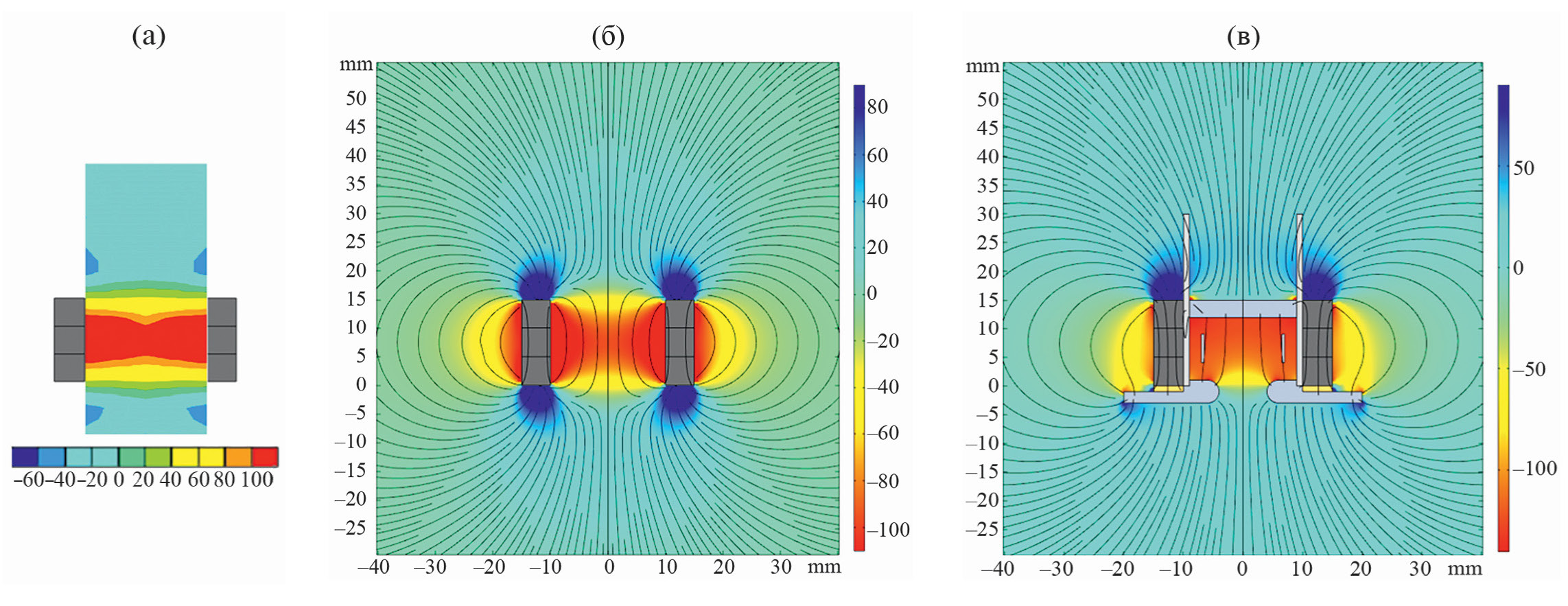 Рис. 5. Распределение индукции магнитного поля системы из трех магнитных колец: а – измеренное с помощью тесламетра, б – расчет без учета конструктивных элементов ПИИ, в – расчет с учетом конструктивных элементов ПИИ.