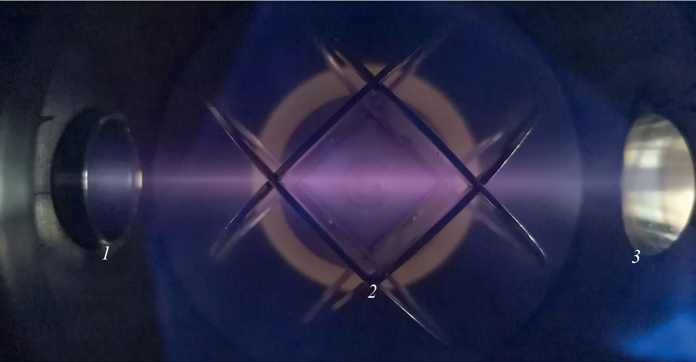 Рис. 9. Характерный вид свечения разряда в дейтерии в камере ИЭУП при работе ПИИ: 1 – ПИИ, 2 – сетчатый катод, 3 – смотровое окно.