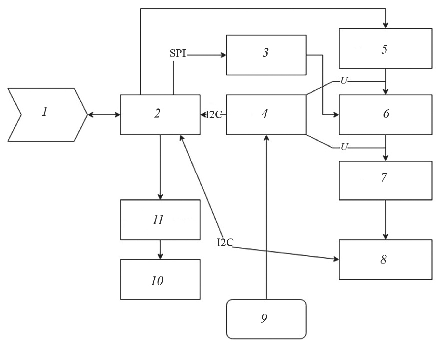 Рис. 2. Блок-схема драйвера устройства: 1 – USB – UART, 2 – микроконтроллер, 3 –регулятор тока, 4 – аналого-цифровой преобразователь, 5 – выключатель лазера, 6 – лазер, 7 – термопара DT, 8 – преобразователь термопары, 9 – шунт.
