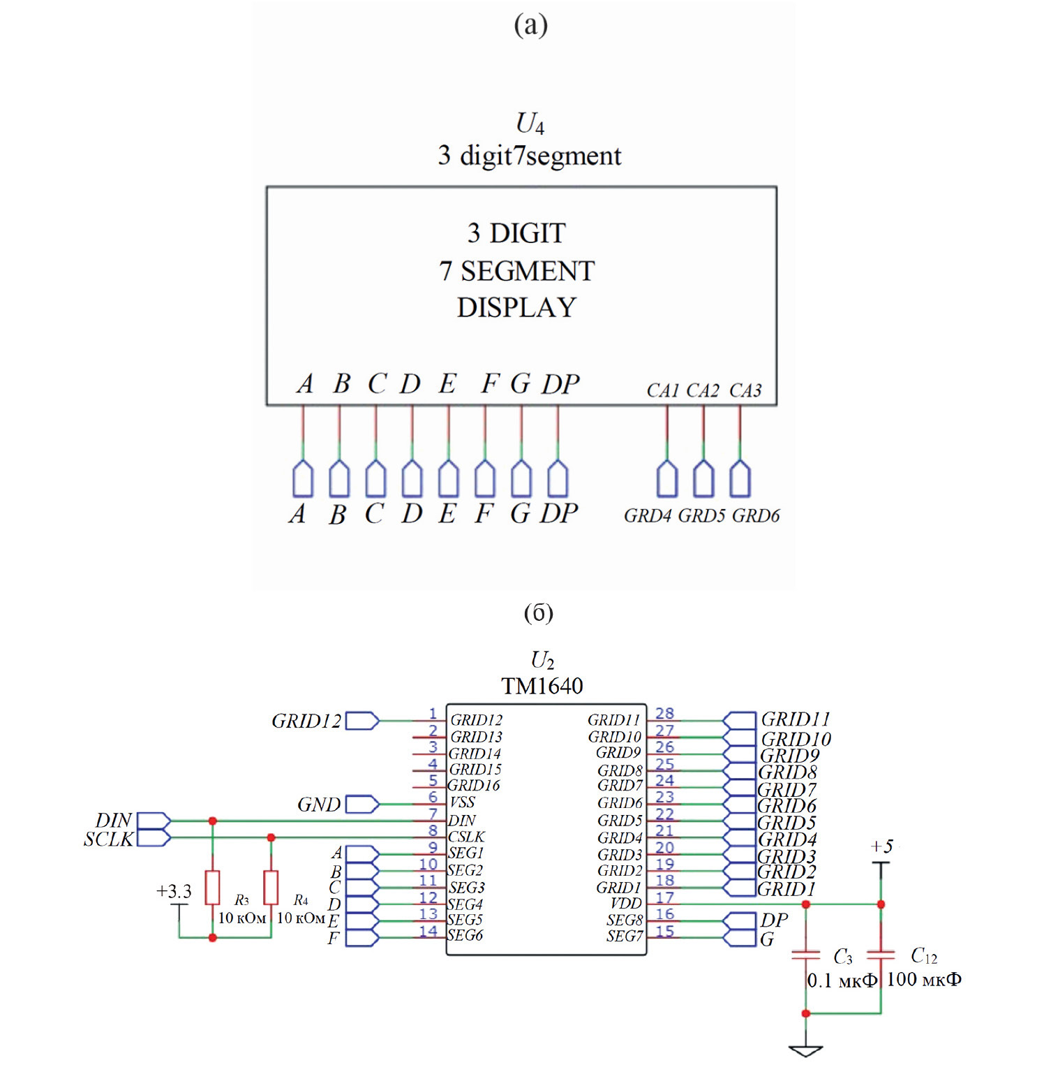 Для управления сегментарными индикаторами используется микросхема ТМ1640 (рис. 7б). Микросхема TM1640 – это управляющий драйвер для светодиодных индикаторов, LED-матриц, семисегментных индикаторов и раздельных светодиодов. Сам драйвер TM1640 управляется микроконтроллером по шине I2C. Напряжение питания составляет 5 ± 10% В. Драйвер поддерживает 8 секций по 16 бит с общим катодом. Входной сигнал передается через двухпроводной последовательный интерфейс CLK, DATA. Также имеется возможность регулировать яркость в пределах 8 рабочих циклов устройства.