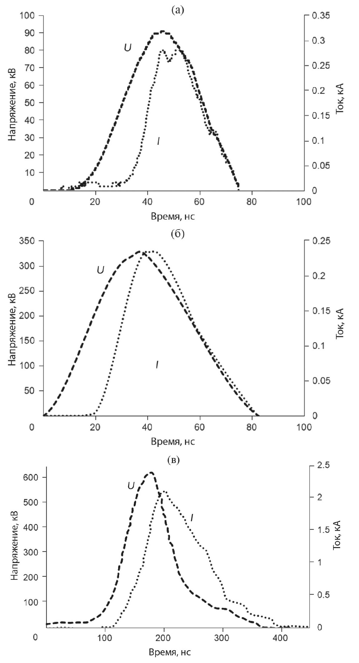 Рис. 1. Графики импульсов напряжений и токов для исследуемых источников излучения: а – источник с пиковым напряжением 90 кВ, б – источник с пиковым напряжением 320 кВ, в – источник с пиковым напряжением 615 кВ.