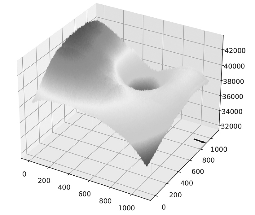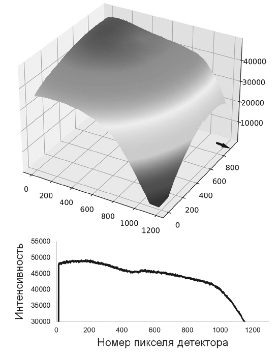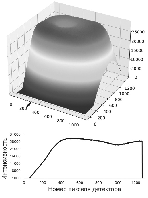 На рис. 4 сверху представлено распределение интенсивности излучения по плоскости детектора в виде 3D-поверхности для импульсного рентгеновского источника с максимальным напряжением 90 кВ и диаметром катода 3 мм. Профиль распределения имеет вид, где максимальная интенсивность излучения наблюдается в центре и снижается к периферии. Явно это представлено на рис. 4 снизу, интенсивность распределения соответствует линии, отмеченной на рис. 4 сверху стрелкой.
