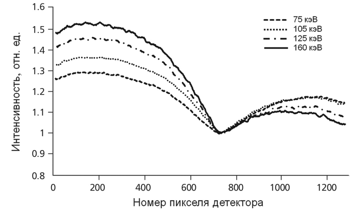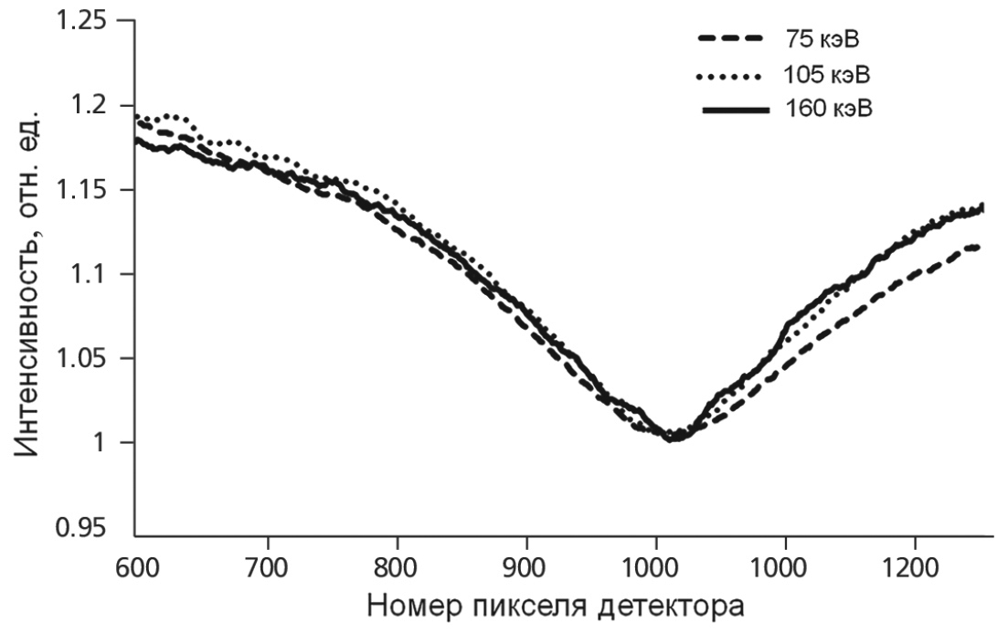 Кривые соответствуют разным эффективным энергиям излучения, которые получены в результате последовательного отсечения низкоэнергетического излучения фильтрами. Следует отметить, что распределение излучения по энергиям практически одинаково по всей линии пикселей детектора (отмечена стрелкой на рис. 6 сверху), слева от пятна с провалом по интенсивности наблюдается небольшое отклонение кривой низкоэнергетического излучения. Однако отклонение невелико и составляет около 3%. Для рентгеновских трубок с меньшими пиковыми значениями напряжения отклонений практически не наблюдается.