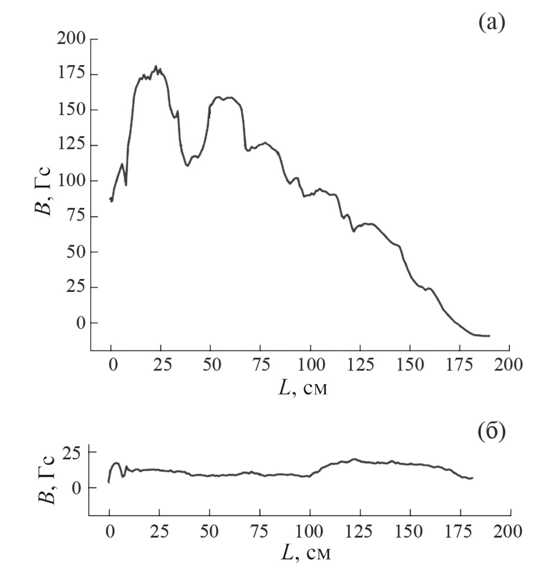 Для определения уровня “паразитного” сигнала выводы индукционных катушек закорачивались, а затем полностью воспроизводилась процедура измерений. На рис. 7 показаны зависимости “паразитного” сигнала от положения каретки в магните. Каретка двигалась от большей координаты к меньшей. Видно, что даже при очень тщательной свивке тонких проводов уровень паразитного сигнала варьируется в диапазоне 7–20 Гс. Из приведенных графиков следует, что влияние сигнальной трассы может приводить к разбросу измерений примерно на ±10 Гс.